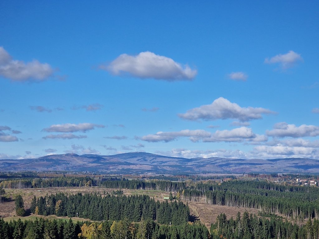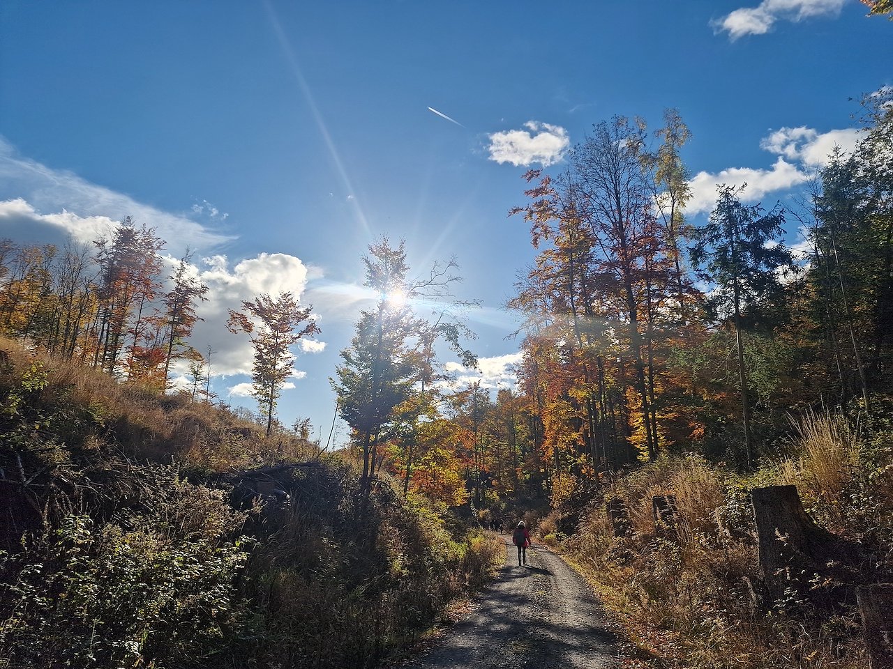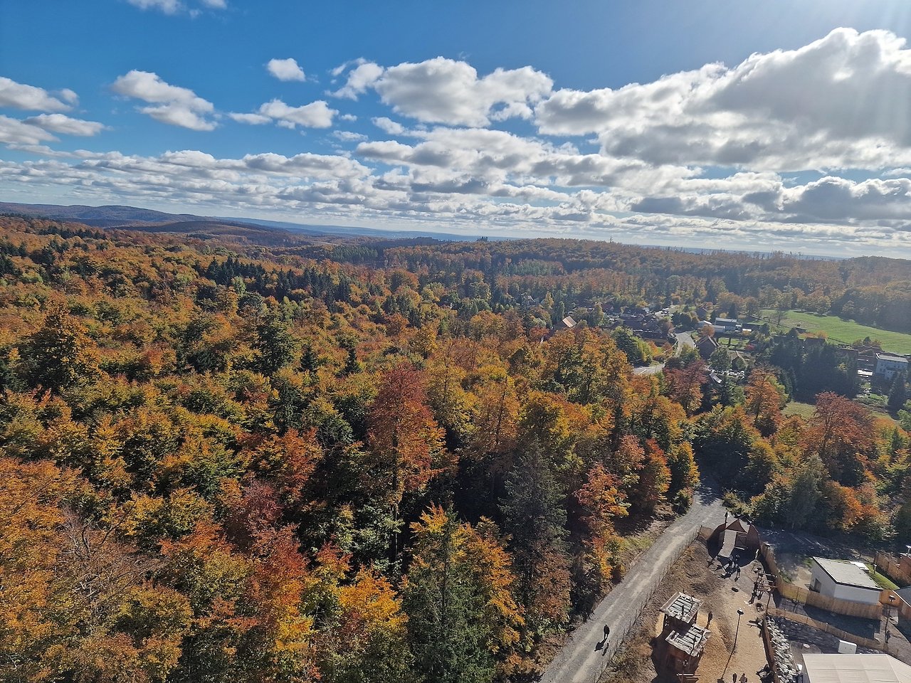 Sonnenschein und herbstliche Farbenpracht waren die Wegbegleiter auf dem Weg zum Turm. Vom Schützenhaus bei Sülzhayn ging es über die alte Poststraße hinauf nach Rothessütte. Kurz vor dem Ort lugte schon der Hexenbesen hervor, von oben bot sich schließlich beste Aussicht über Harz und Herbstwald.