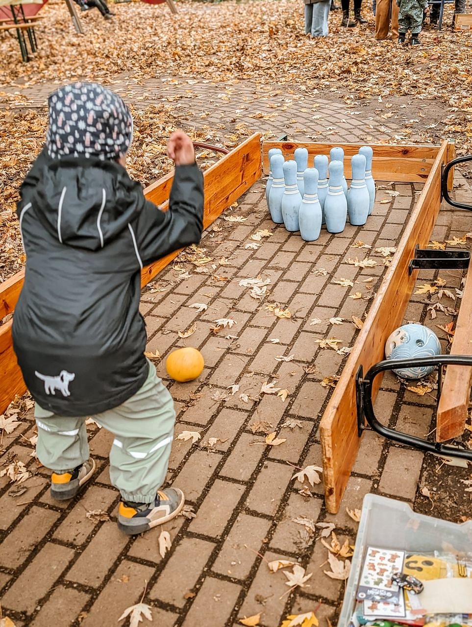 Auch beim Kürbisbowling ging es sportlich zu, und an kleinen Feuerschalen duftete es verlockend nach frisch gebackenem Stockbrot, das Kinder und Eltern gemeinsam zubereiteten. Den Teig haben die Kinder im Vorfeld mit den Pädagog:innen vorbereitet. Eine kreativ hergerichtete Ecke unter dem Motto Wir geben Büchern eine zweite Chance lud zum Stöbern ein. Die Kinder durften sich an diesem Stand Bücher aussuchen und mit nach Hause nehmen. Für das leibliche Wohl war selbstverständlich bestens gesorgt.