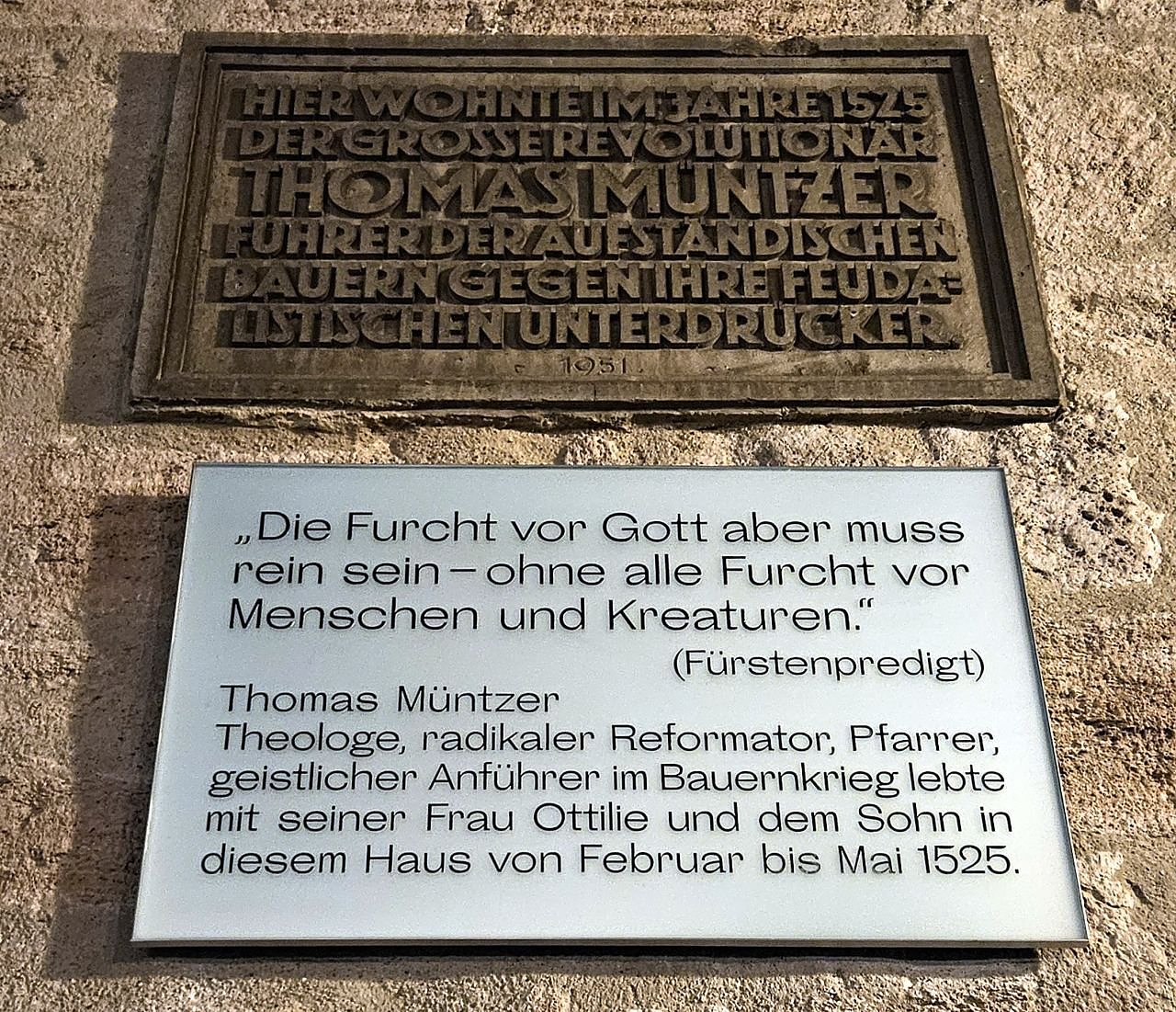 Thomas Müntzer – Theologe, radikaler Reformator, Pfarrer, geistlicher Anführer im Bauernkrieg, lebte mit seiner Frau Ottilie und dem Sohn in diesem Haus von Februar bis Mai 1525.