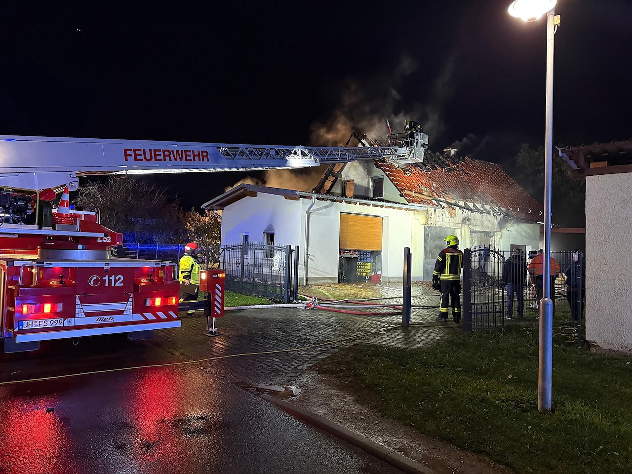 Ein Nachbar bemerkte den Brand und informierte den noch schlafenden Grundstückseigentümer. Beim Eintreffen der Feuerwehr stand ein Teil eines Nebengebäudes mit Garagen und Werkstatt bereits im Vollbrand. Daraufhin wurden weitere Kräfte nachalarmiert. Den Einsatzkräften gelang es in der Folge, ein Übergreifen der Flammen auf weitere Gebäudeabschnitte zu verhindern.