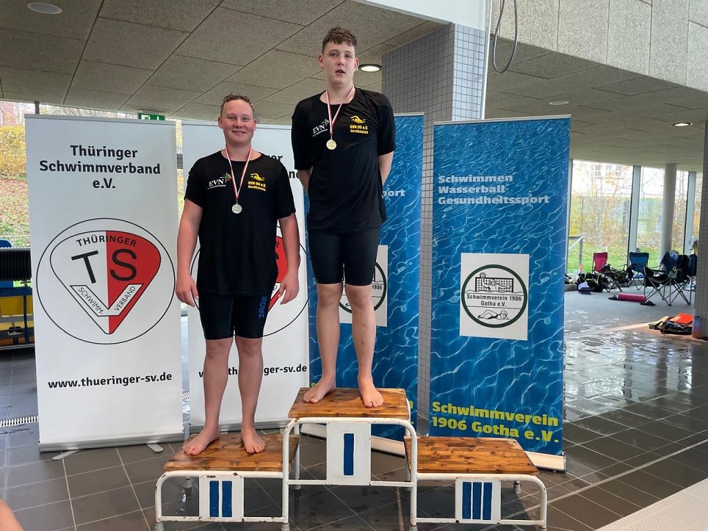 Henry Schaefer (JG 2010) schwamm 2-mal in seiner Hauptlage zum Thüringer Jahrgangsmeister in 100 m und 200 m Delphin. In 200 m Delphin belegte Henry im offenen Finale noch Platz 5. Tom Falke (JG 2010) siegte in 50 und 100 Meter Rücken und wurde somit Thüringer Jahrgangsmeister. Silber holte er sich in 50, 100 und 200 m Brust, in 200 m Freistil und 200 m Rücken. Auch er stand im offenen Finale mit 200 m Freistil. Paul Höpfner (JG 2010) unterstützte die Mannschaft am ersten Wettkampftag durch seinen Einsatz als Kampfrichter. Am 2. Tag ging Paul 4-mal an den Start und stand auch 4-mal auf dem Treppchen- Gold und Thüringer Jahrgangsmeister in 200 m Brust, Silber in 100 m Rücken und 200 m Freistil und Bronze in 50 Brust. Mit der Leistung in 200 m Brust gab es noch den Startplatz im offenen Finale.