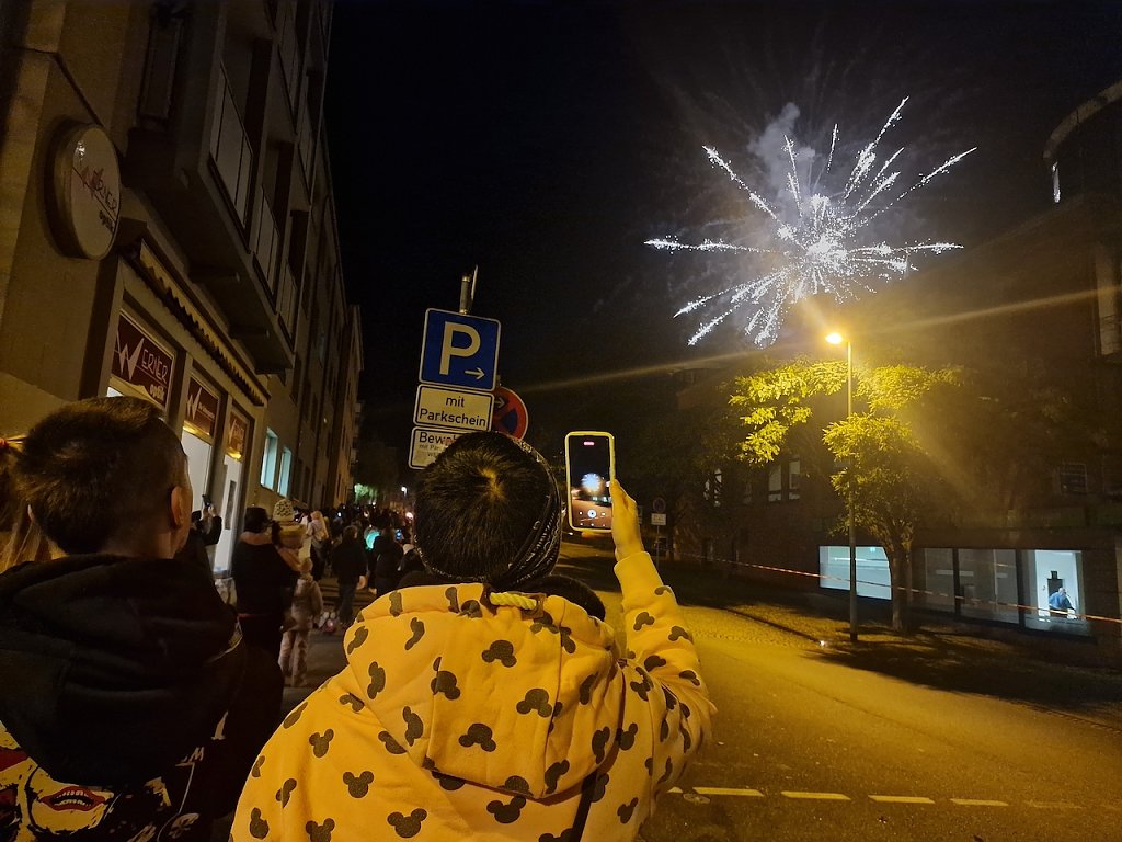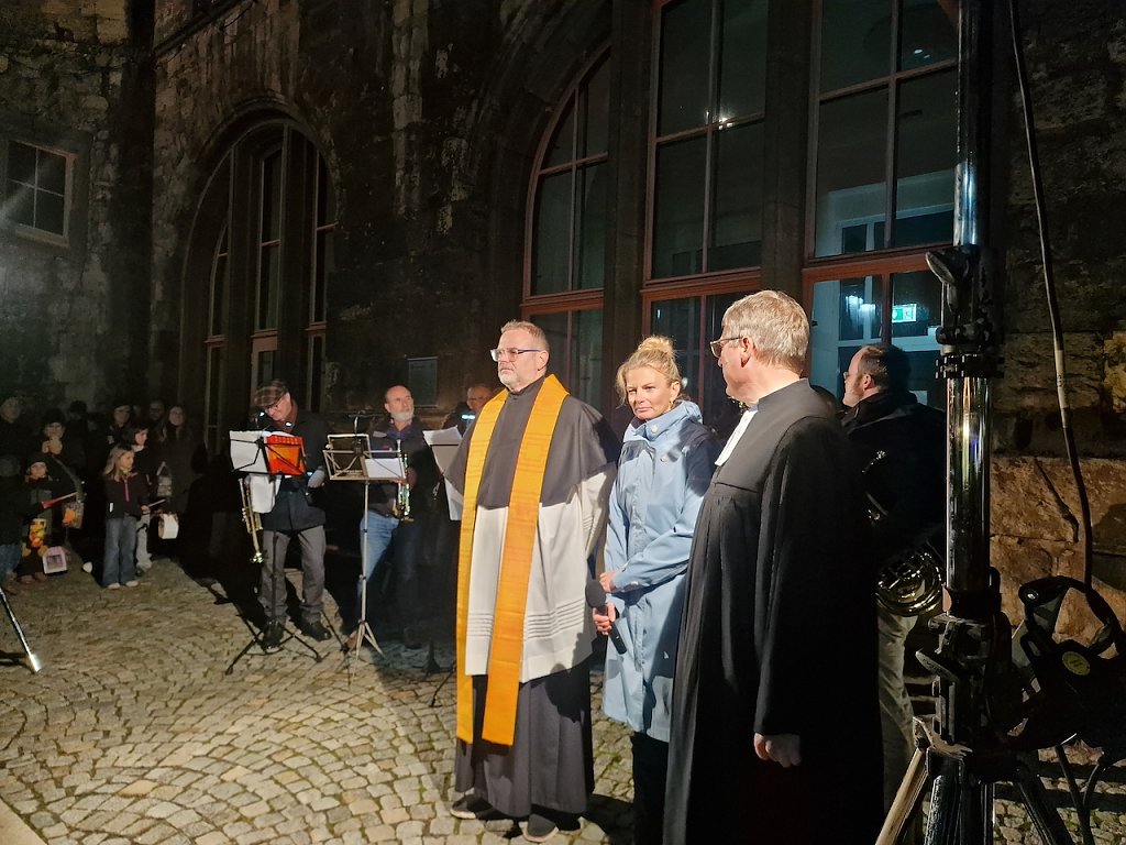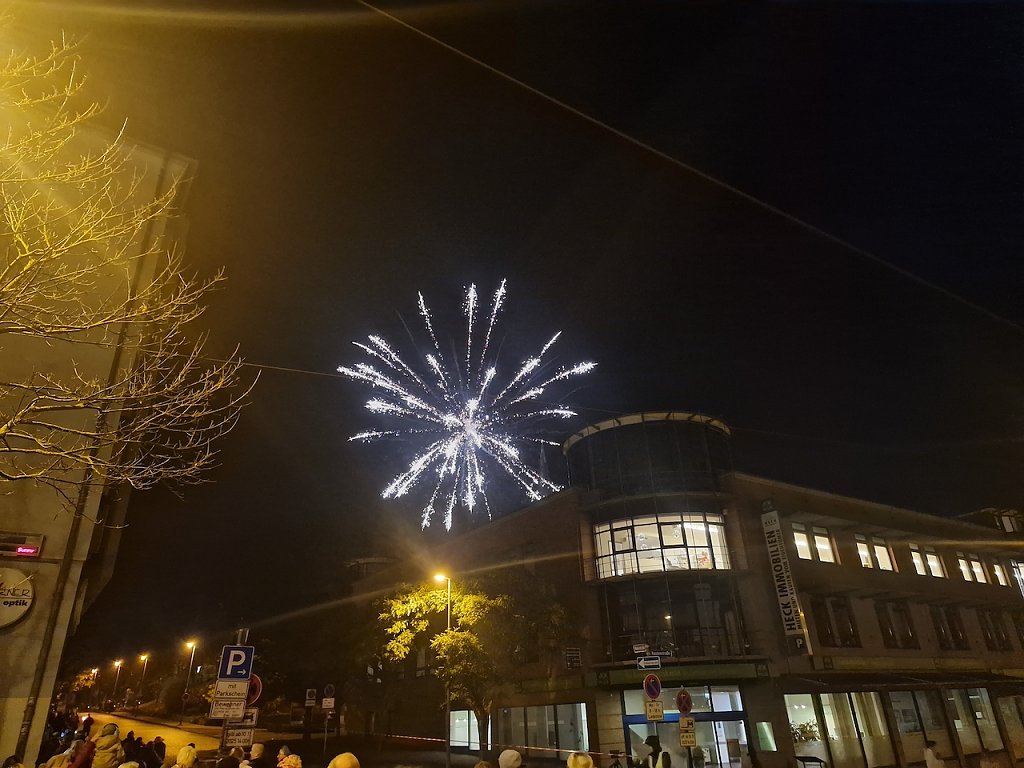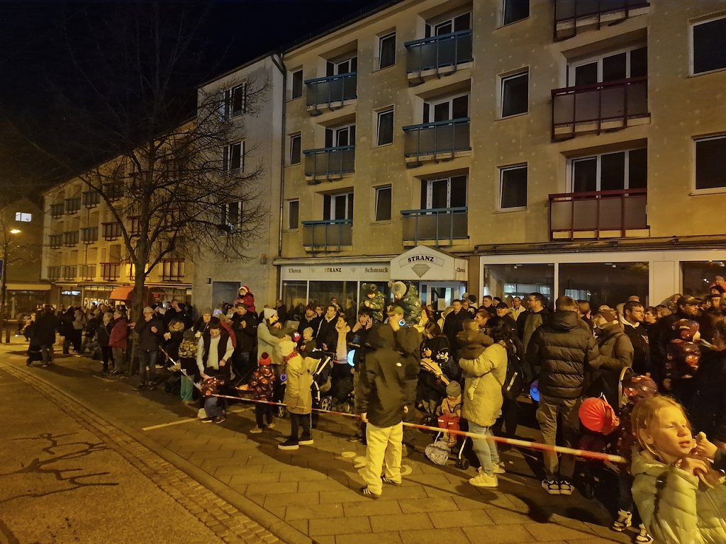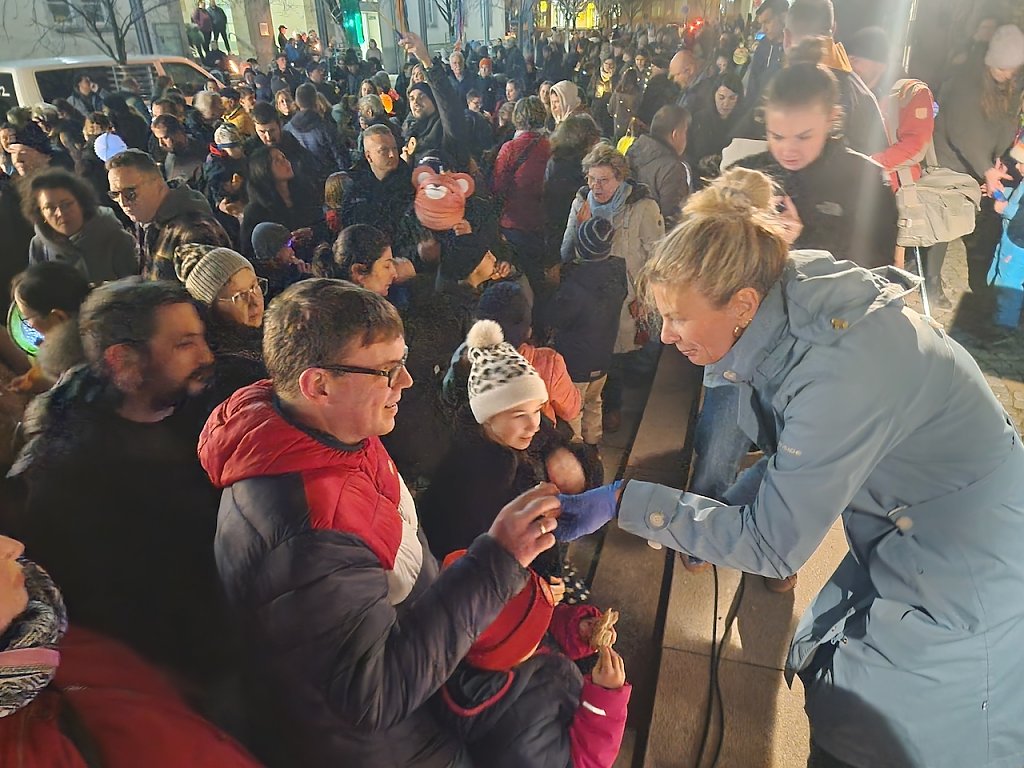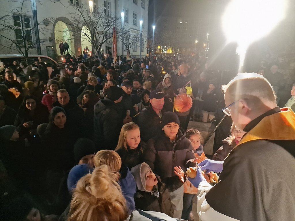 Mit dem letzten Tageslicht begann am späten Nachmittag die traditionelle Martinifeier vor der Blasiikirche. Im ökumenischen Gottesdienst wurde die Martinsgeschichte erzählt und gesungen, danach ging es im Lichterzug auf den Rathausplatz, wo die Brezeln geteilt und das Feuerwerk bestaunt werden konnte.