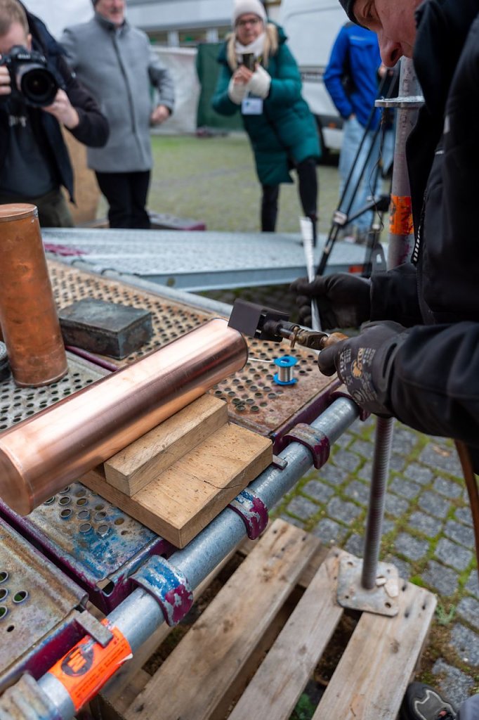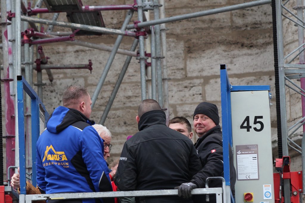 Dann ging es auch schon hinauf in himmlische Höhe, wo ein kalter Wind den Überbringern der Kapsel ins Gesicht blies und die ersten zarten Schneeflocken ihre Gesichter umtanzten. Die anschließende Aufsetzung der Turmbekrönung der Marktkirche mit einem goldenen Engel und einem Kreuz bildete den Abschluss der Zeremonie.