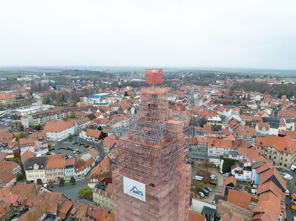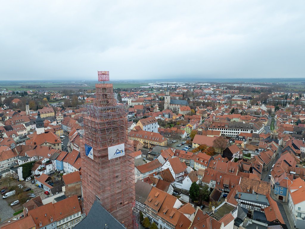 Der Turm der Marktkirche ist das optisch markante und zentrale Bauwerk der Stadt Bad Langensalza mit erheblicher historischer und städtebaulicher Bedeutung. Vorbilder findet der Turm in den sogenannten Belfrieds, den zentralen Stadt- und Kirchtürmen Flanderns aus der Spätgotik und Renaissance oder in Jerusalem. Wann genau das Gerüst wieder abgebaut und der Blick auf den sanierten Turm freigegeben wird, konnte heute noch nicht terminiert werden.