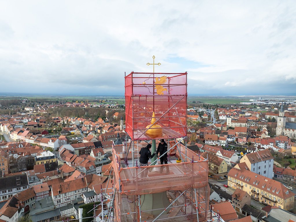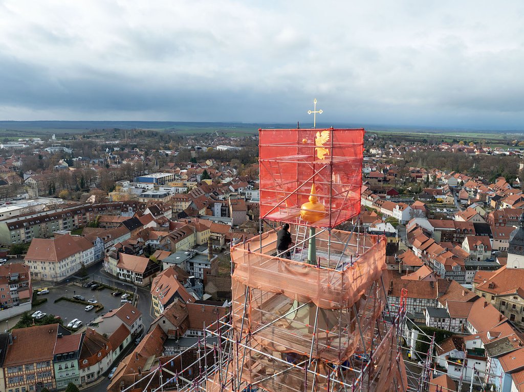 Den Buß- und Bettag hatte sich die evangelische Kirche Bad Langensalzas auserkoren, um in luftiger Höhe von über 70 Metern Zeitkapseln in den Turm der Marktkirche einzufügen, die kommenden Generationen von der heutigen Zeit künden sollen. Uns kündigt die Veranstaltung an, dass die aufwändige Restaurierung des Wahrzeichens der Kurstadt sich dem Ende nähert