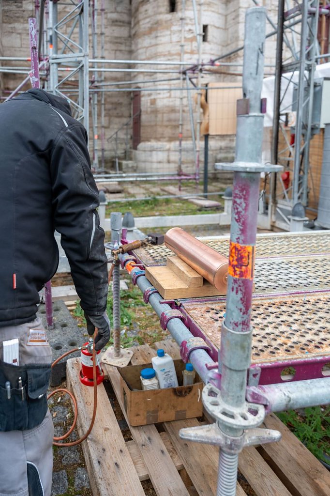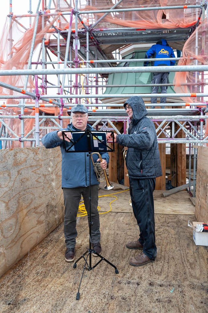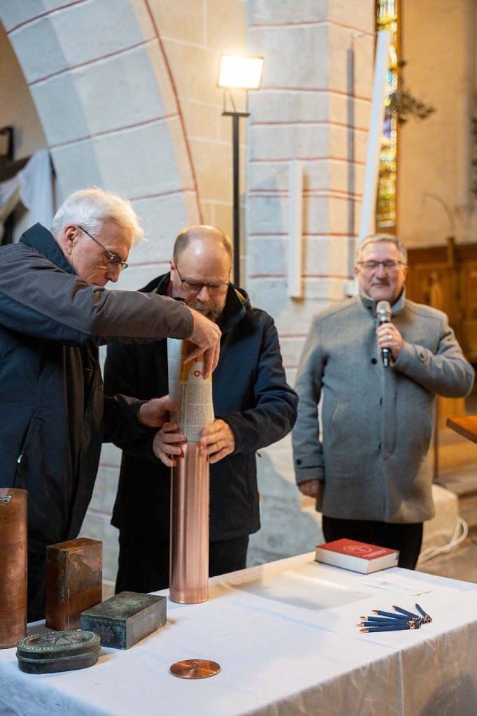 Einlegung der Zeitkapsel 2025 in luftiger Höhe auf der Marktkirche in Bad Langensalza (Foto: Eva Maria Wiegand)