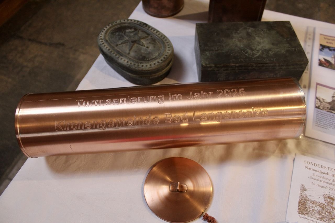 Die Einlegung der Dokumente in die Zeitkapseln 2025 bereiteten Gemeindemitglieder und lokale Vertreter von Gesellschaft und Verwaltung gemeinsam vor. Neben einer gedruckten Tageszeitung, einer Kirchenzeitung mit Bezug auf den Bau, einem Baubericht mit Fotodokumentation sowie einem Bericht des beteiligten Ingenieurbüros zur Sanierung fanden auch mehrere andere Schreiben Eingang in die Kapsel. Briefe des Bürgermeisters und des Stadtrates schildern die heutige Situation in Bad Langensalza, der städtische Numismatikerverein und der Heimat- und Geschichtsverein spendeten einen Satz aktueller Münzen sowie einiger Sonderexemplare und ein Sonderdruck der örtlichen Buchdruckerei im Schlösschenpark sollen zukünftigen Langensalzaern vom Jahre 2025 erzählen.