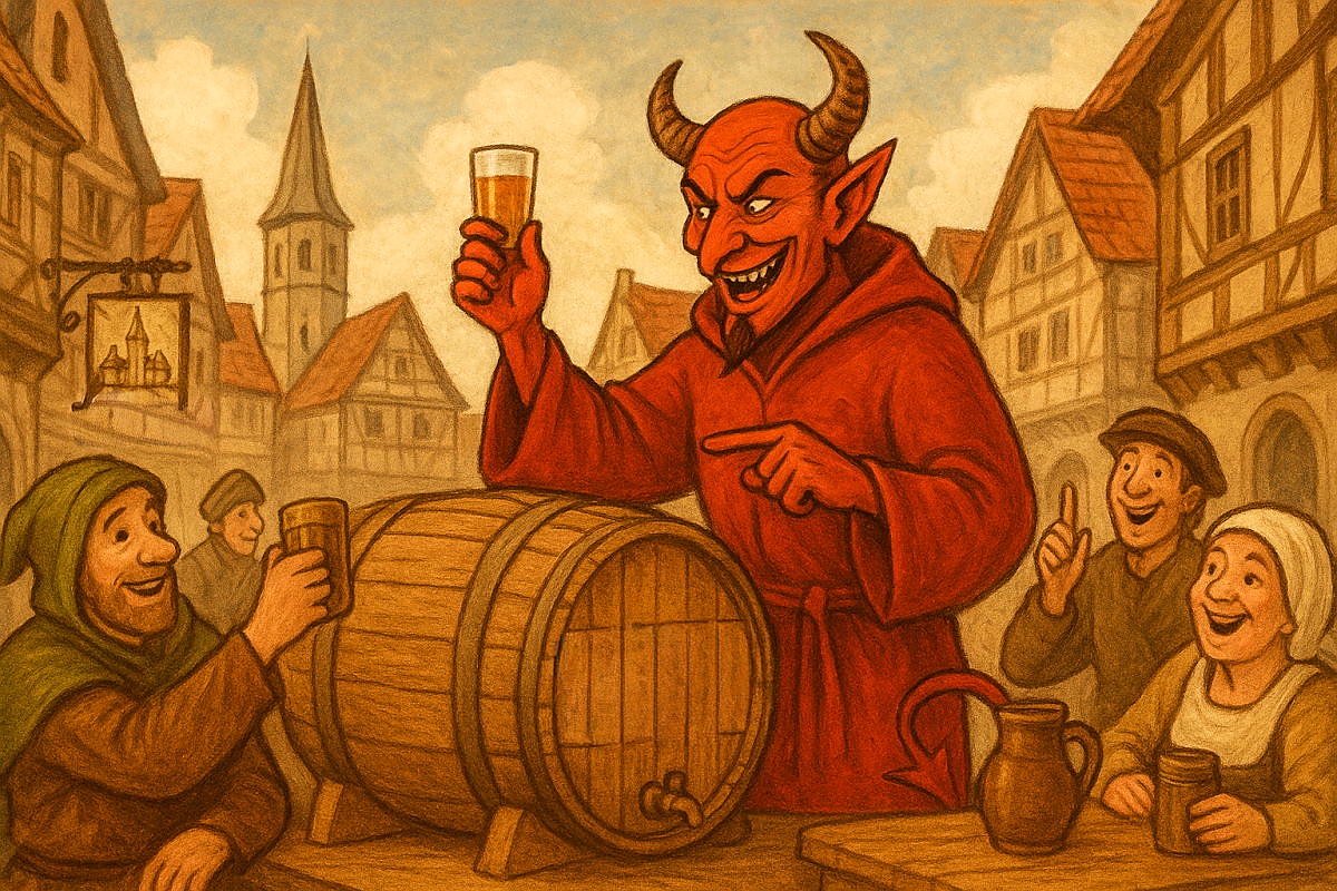 Un dr Deiwel? Der stand eines Morgens mitten auf'm Kornmarkt, glotzte die Leute an, wie sie fröhlich un breit grinsend ihr eigenes Zeug herstellen – besser als seins.Da hat er sich genervt die Hörner gekratzt un gemurmelt: Verflucht! Die Nordhuser sin mir zu hartnäckich! Die saufn mir nich ins Verderben – die feiern sich höchstens rein!