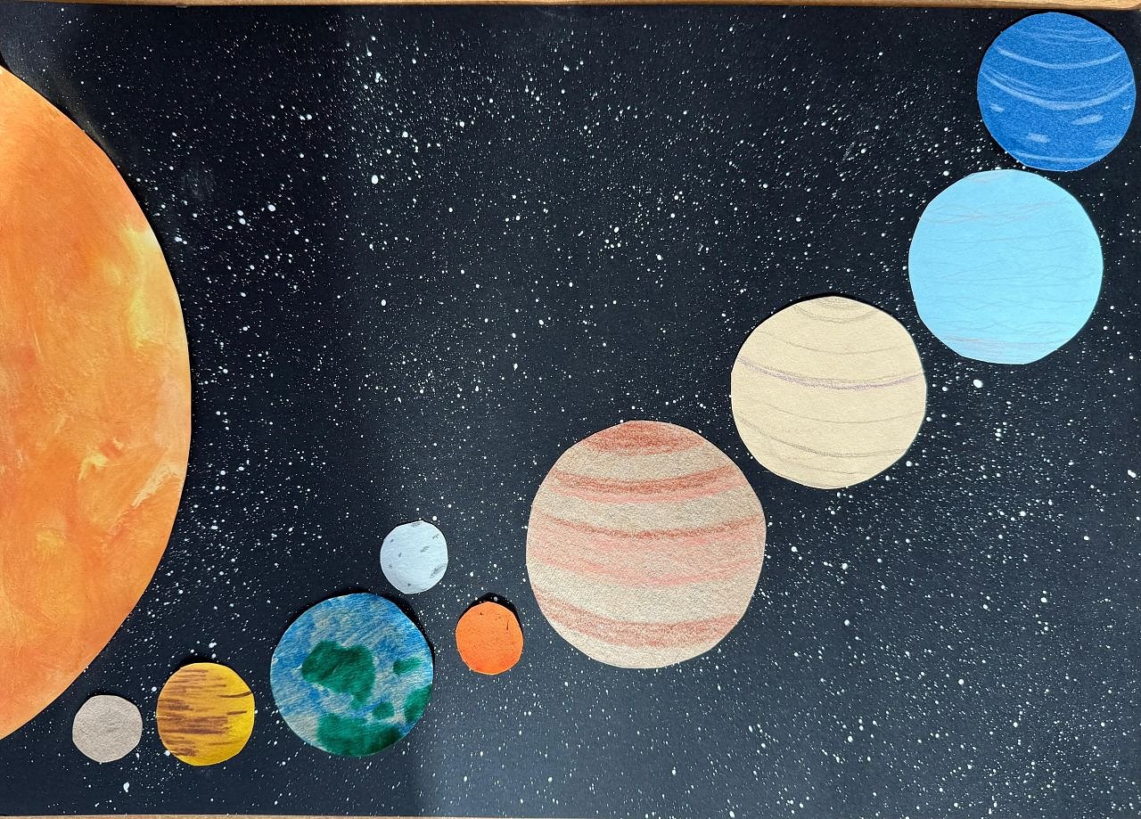 Die 1. Klasse näherte sich dem Thema vor allem spielerisch und gestalterisch: Sie betrachtete Bilder von Sonne und Mond sowie den Planeten, lernte einfache Sternbilder kennen und sprach darüber, was man am Himmel sehen kann.