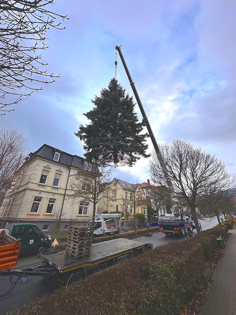 Rechtzeitig zur Vorweihnachtsstimmung wurde am Mittwoch der Weihnachtsbaum auf dem Marktplatz der Stadt aufgestellt. Mitarbeiter des städtischen Bauhofes holten die neun-Meter hohe blaue Stechfichte in der Possenallee ab und brachten sie vorsichtig vor das Rathaus. Dort wurde der Baum zurechtgestutzt, damit er in die dortigen Bodenverankerung passte. Am Donnerstag wurden dann Lichterketten und Christbaumkugeln angebracht.