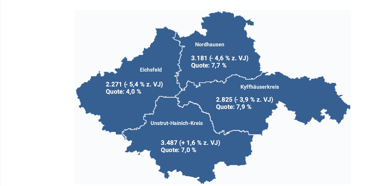 Die Arbeitslosigkeit im Kyffhäuserkreis ist im November 2025 leicht gestiegen. 2.825 Menschen waren arbeitslos gemeldet. Das waren 25 Personen mehr (0,9 Prozent) als im Oktober aber 114 Arbeitslose bzw. 3,9 Prozent weniger als vor einem Jahr. Die Arbeitslosenquote betrug 7,9 Prozent und lag damit 0,2 Prozentpunkte unter dem Wert des Vorjahres.