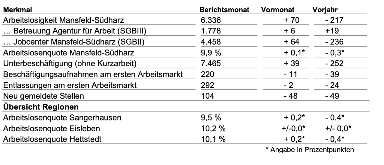 Die Arbeitslosenquote, bezogen auf alle zivilen Erwerbspersonen, steigt leicht auf 9,9 Prozent. Trotz eines leichten Rückgangs der Arbeitslosigkeit im Vergleich zum Vorjahresmonat ist im Agenturbezirk weiterhin keine Trendwende am Arbeitsmarkt erkennbar. Die erwartete Herbstbelebung bleibt in diesem Jahr weitgehend aus, da der wirtschaftliche Aufschwung bislang fehlt. Die Agentur für Arbeit Sachsen-Anhalt Süd setzt weiterhin auf die gezielte Unterstützung für Arbeitnehmerinnen und Arbeitnehmer sowie für Unternehmen, um den regionalen Arbeitsmarkt langfristig zu stärken und die branchenspezifischen Fachkräftebedarfe zu decken, so Simone Meißner Chefin der Arbeitsagentur