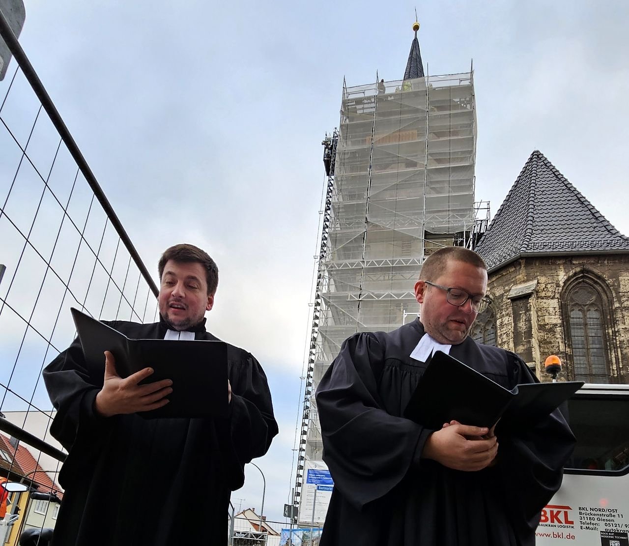 Diesen historischen Tag voller Dankbarkeit begleitete abschließend eine Andacht der Pfarrer Themel und Ebert mitten im Geschehen an der Straßenkreuzung neben dem lautstark brummenden Kranwagen. Pfarrer Ebert wagte sogar den Aufstieg per Kran Richtung Turmspitze, um ein Gebet zu sprechen – gesichert durch einen Klettergurt unter dem Talar.