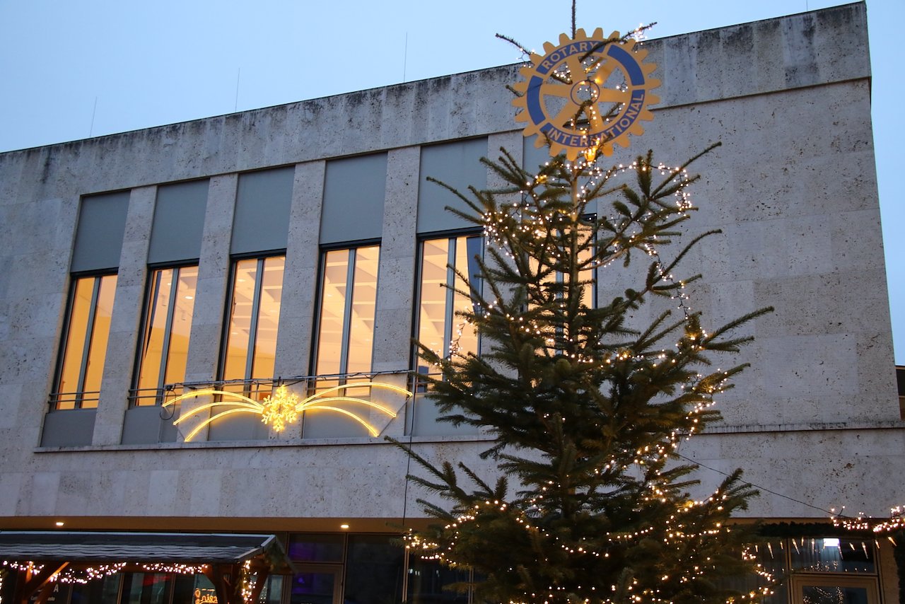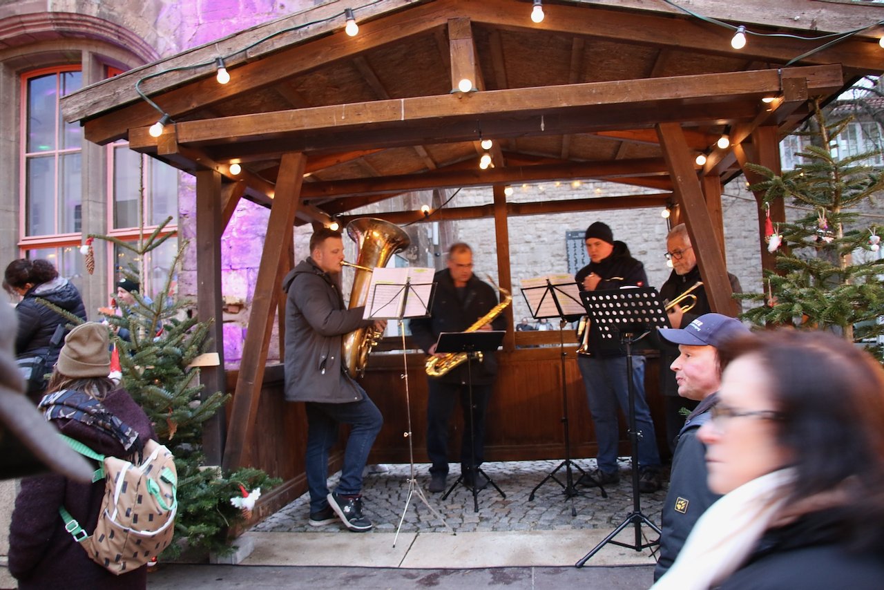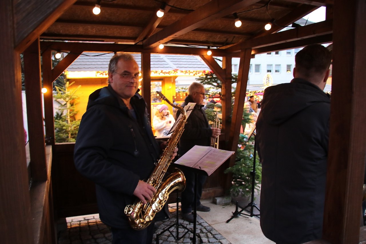 Zwischen Märchenwald und Glühweinstand versammelte sich zahlreiches Volk heute Nachmittag vor dem Rathaus um dem Stollenanschnitt beizuwohnen. Zusammen mit dem Weihnachtsmann verteilte die Rathausspitze Gebäck an das Publikum, begleitet von den Blasmusikern, die wieder einen eigenen Unterstand bekommen haben.