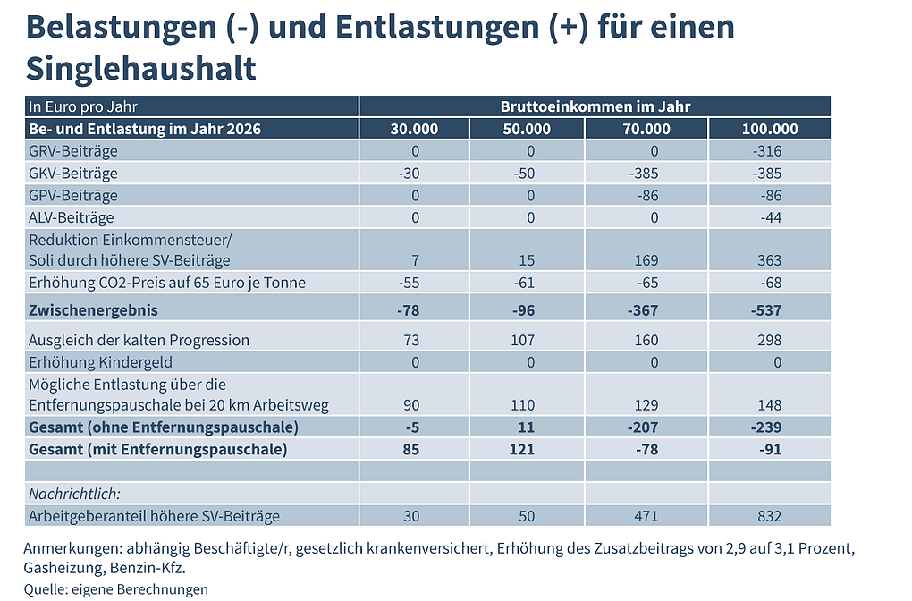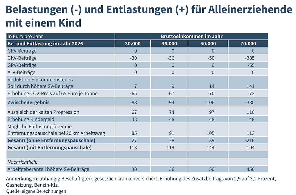 Besonders für Haushalte mit hohem Einkommen wird es teurer: Wer 100.000 Euro im Jahr verdient, muss mit einem Minus von 239 Euro rechnen; selbst Pendler zahlen netto drauf. Auch Alleinerziehende mit einem höheren Einkommen müssen mehr zahlen. Bei einem Jahreseinkommen von 70.000 Euro hat eine alleinerziehende Person 216 Euro weniger auf dem Konto.