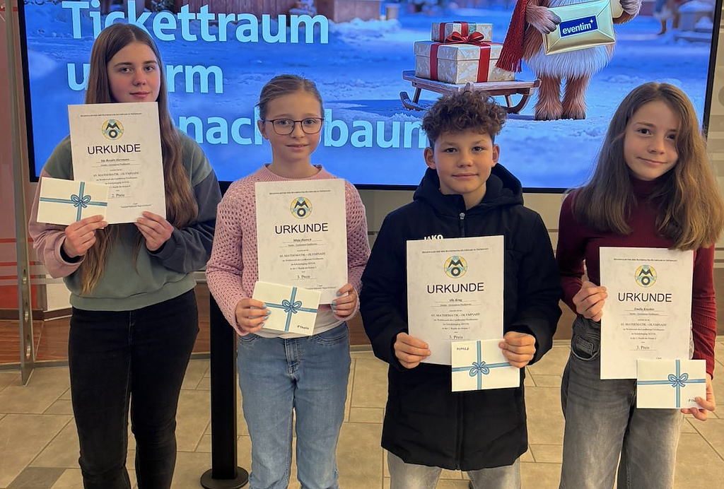 Sie haben sich damit auch für die Landesrunde qualifiziert, die am 27. und 28. Februar 2026 in Erfurt ausgetragen wird. [Hier Bild einfügen, von links nach rechts sind zu sehen: Ida Rosalie Hermann (8.4), Mirja Dietrich (5.1), Ole Krug (5.1), Emilia Kreckler (6.2)] In der Klassenstufe 5 erreichten Ole Krug und Mirja Dietrich jeweils einen dritten Platz.