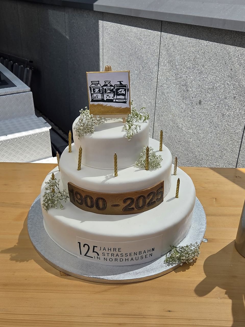 Anlässlich des Rolandsfestes fuhr ein großer Straßenbahn-Korso durch die Nordhäuser Innenstadt. Die drei historischen Nordhäuser Straßenbahnen, ein Gastwagen aus Gotha, Combinos aller Generationen und Spezialfahrzeuge haben nacheinander das Nordhäuser Zentrum am Rolandsfest-Samstag durchfahren. Interessierte und Straßenbahnfans konnten, nach dem Erwerb eines Jubiläumsfahrscheines, im Umzug mit einigen Wagen mitfahren. Bürgermeisterin Alexandra Rieger und Geschäftsführer Thorsten Schwarz moderierten, gemeinsam mit ihren Gästen, den gut besuchten Umzug. Den Umzug führte eine Jubiläumstorte auf Schienen an, deren süße Nachbildung von der Bäckerei Meyer aus Bleicherode schnell reißenden Absatz am Tortenbuffet fand.