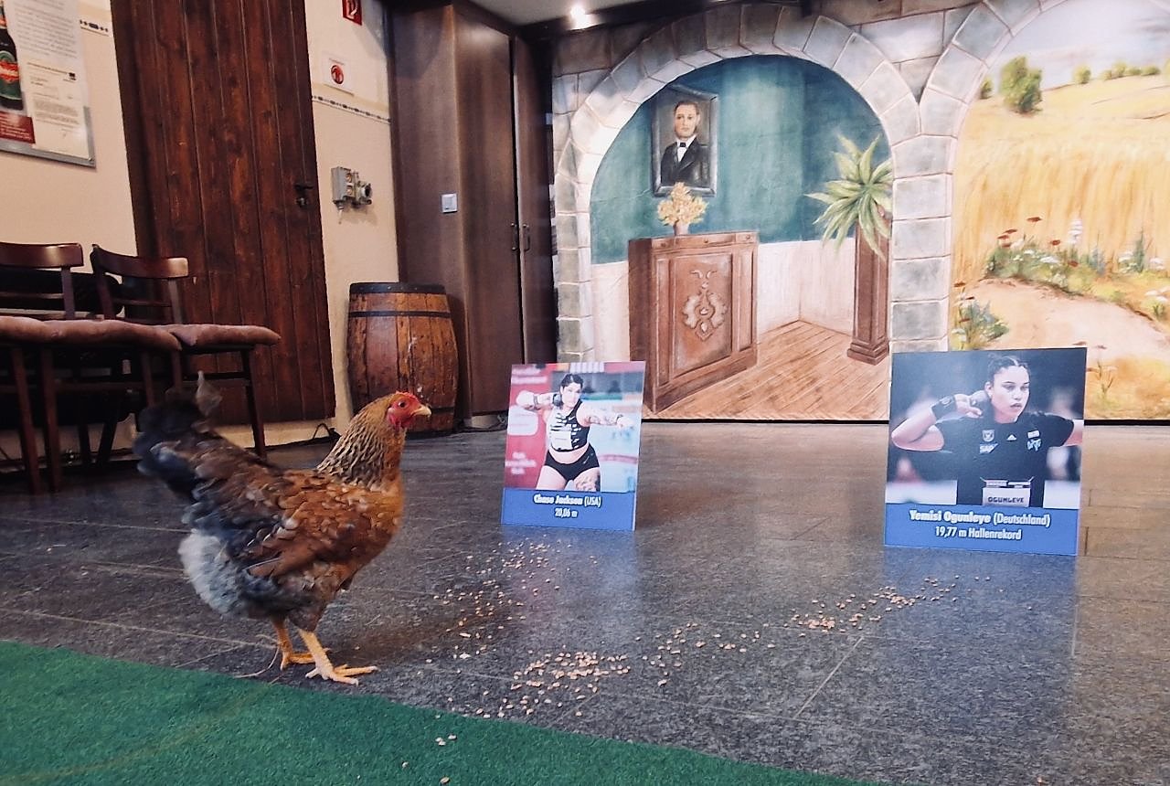 Wer wird beim 17. Kugelstoß-Indoor den Sieg davontragen? Chase Jackson oder Yemisi Ogunleye? Huhn Henriette hat heute entschieden (Foto: agl)