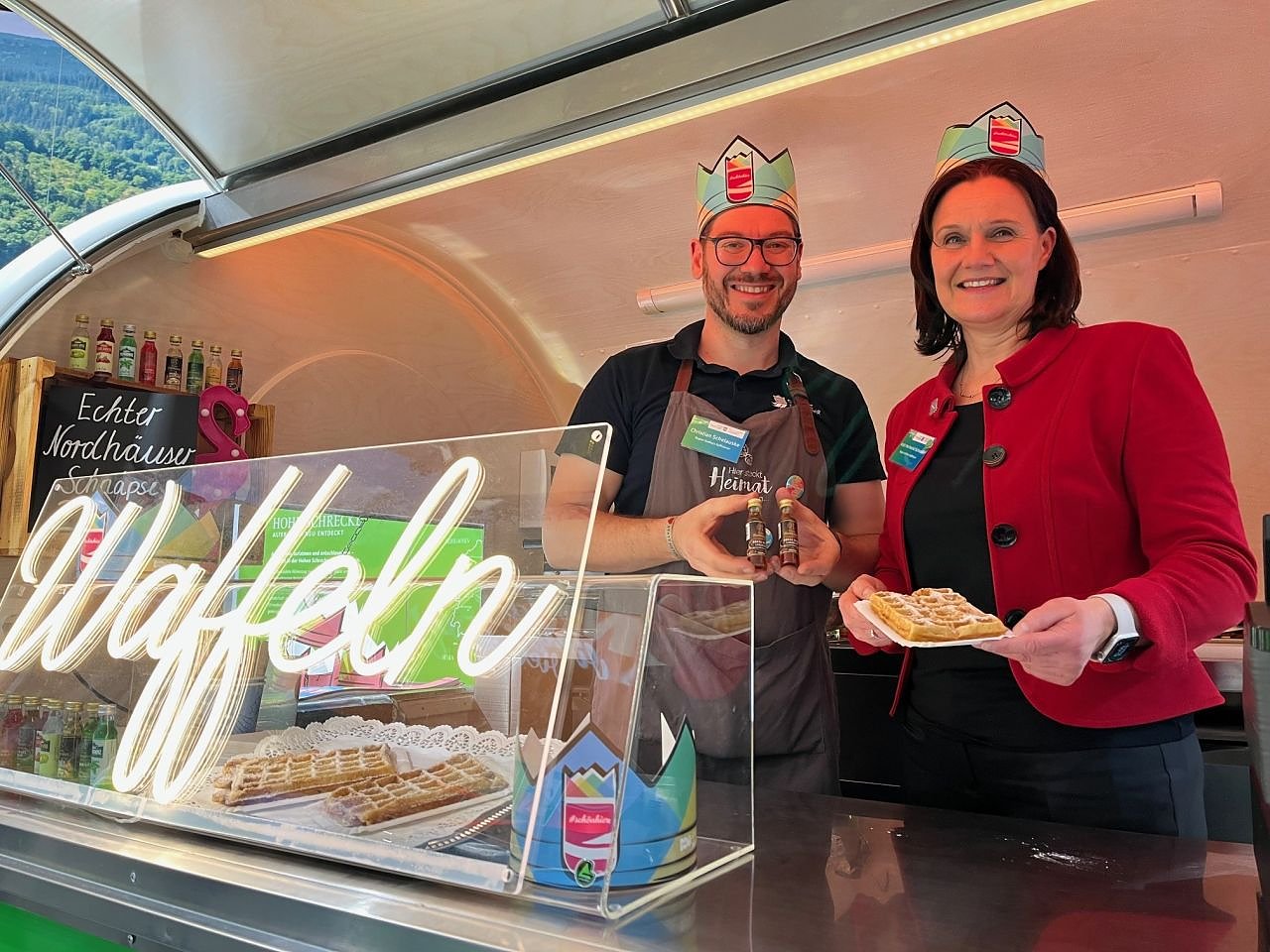 Landrätin Antje Hochwind-Schneider und Christian Schelauske, Tourismusverband Südharz Kyffhäuser, am mobilen Hofwagen. (Foto: Andrea Hellmann )
