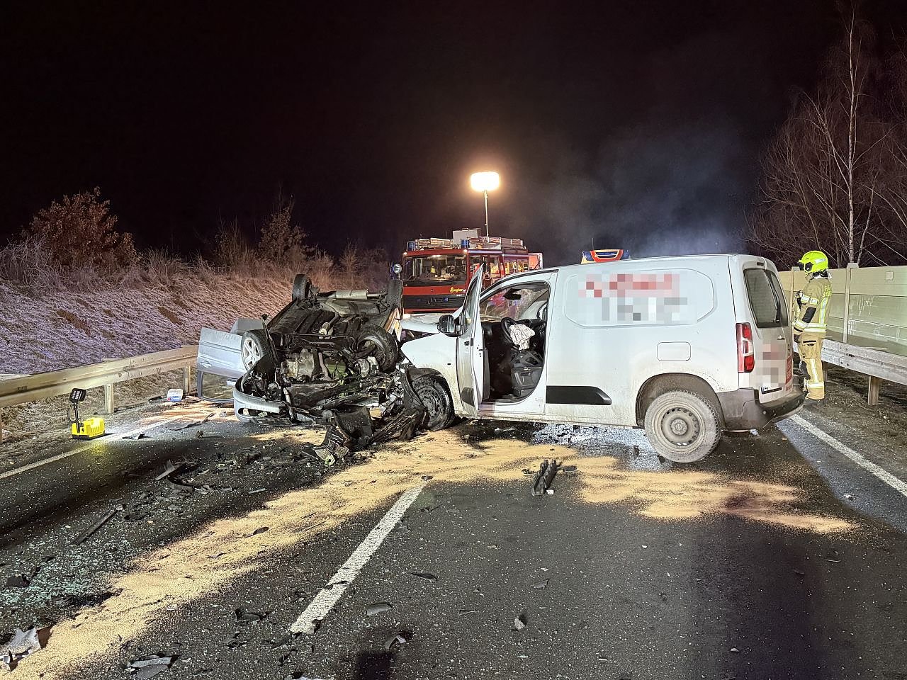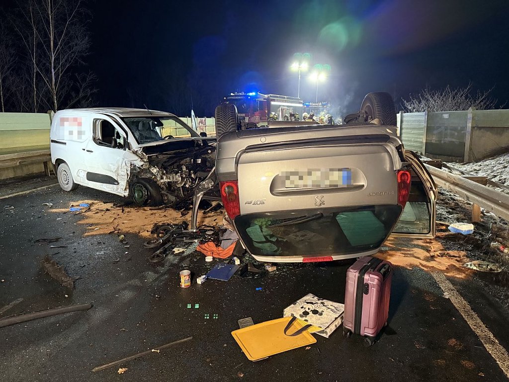 Durch die Wucht des Aufpralls wurde der Kastenwagen auf die Gegenfahrbahn geschleudert, der Peugeot überschlug sich und blieb auf dem Dach liegen.