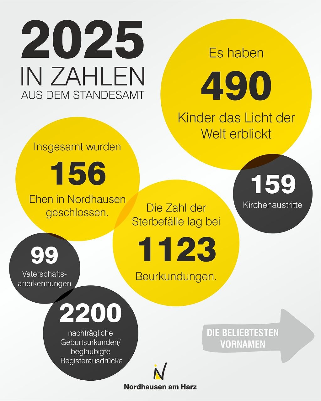 Ebenfalls gestiegen ist die Zahl der Sterbefälle auf 1123 (2024 – 1095). 490 Neugeborene wurden im Jahr 2025 in Nordhausen beurkundet, davon 252 Jungs und 238 Mädchen. Besonders beliebt bei den Eltern waren dabei folgende Namen: