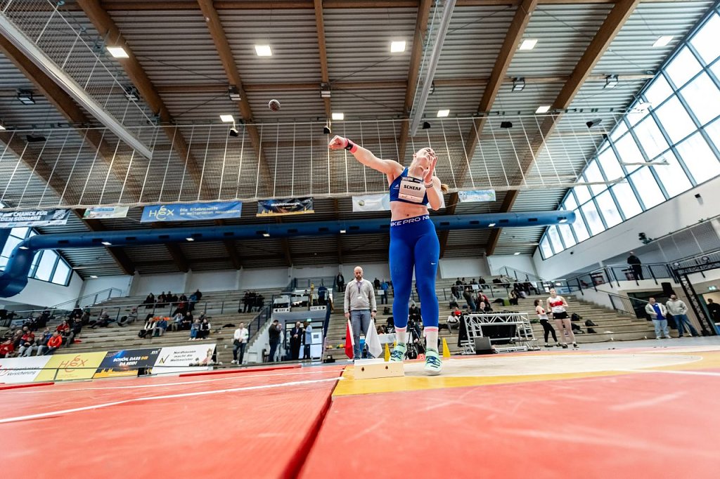 Das erste Mal über 16 Meter: Das gelang Emily Scherf (SC Neubrandenburg) in der U20-Konkurrenz. Gleich im ersten Versuch wuchtete sie ihr Arbeitsgerät auf die neue persönliche Bestmarke von 16,24 Metern. Mit dieser Leistung setzte sich die 19-Jährige an die Spitze der deutschen U20-Hallenbestenliste. Ich bin sehr, sehr zufrieden, dass ich die persönlicheBestleistung stoßen konnte, und dann auch noch im ersten Versuch. Gefreut habe ich mich, dass es über 16 Meter ging. Das war schon mein Ziel für den Wettkampf, resümierte Emily Scherf, die noch am vergangenen Wochenende mit 40 Grad Fieber im Bett gelegen hatte. Trotz der neuen Bestmarke sah sie noch viel Potenzial: Es war kein Stoß dabei, wo ich sage, den habe ich richtig getroffen.