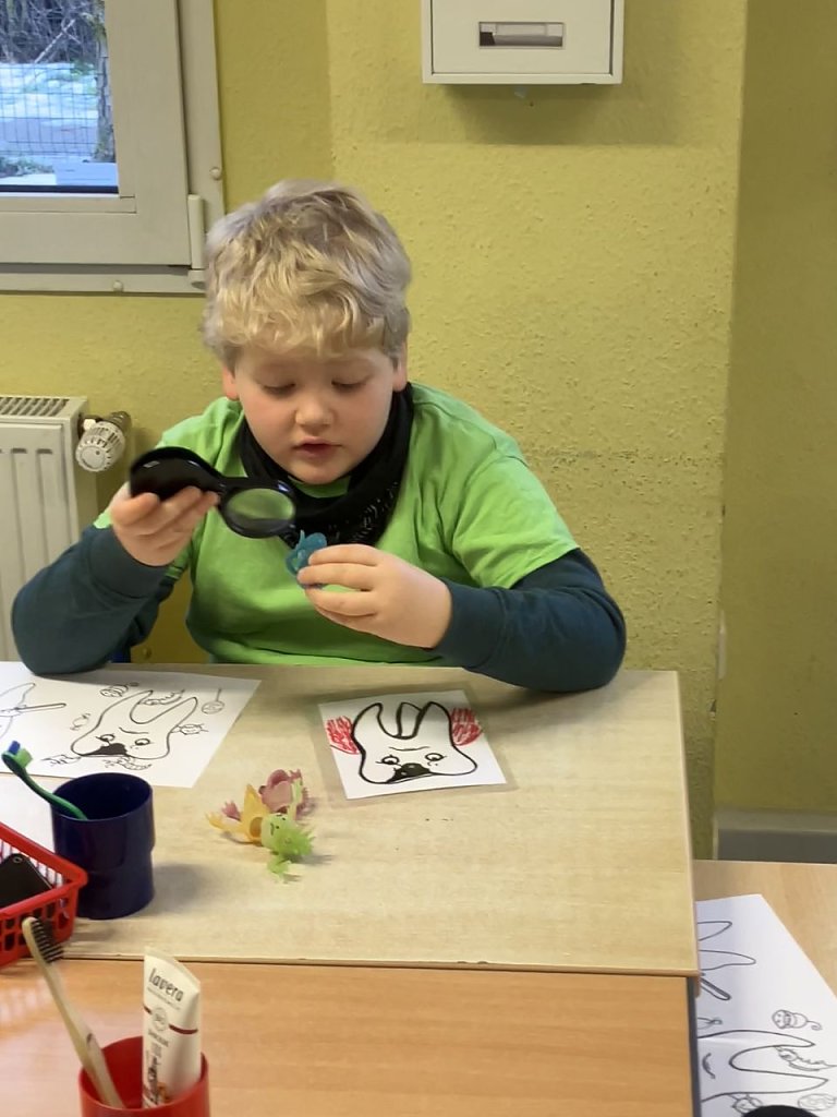 Es wurde geknetet, gebastelt, geforscht und ausprobiert. Die Kinder formten eigene Gebisse, gestalteten informative Plakate und entdeckten Zahnbakterien mit der Lupe. Besonders spannend war das Anfärben der Zähne. Dabei konnten die Grundschülerinnen und Grundschüler selbst sehen, wo noch Beläge vorhanden waren – und im Anschluss direkt noch einmal die richtige Putztechnik üben.