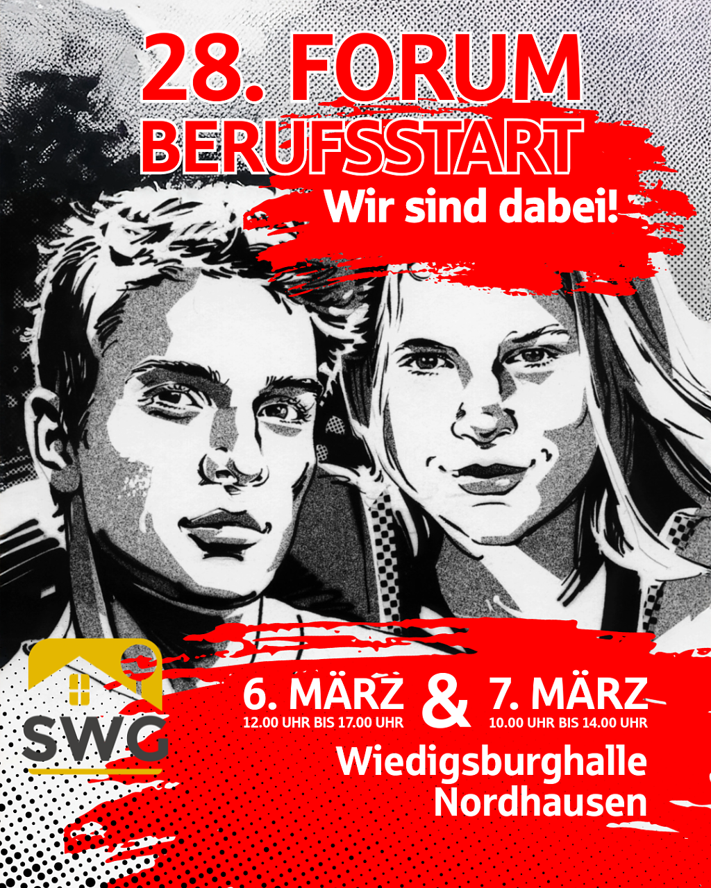 Die Städtische Wohnungsbaugesellschaft (SWG) präsentiert sich und ihre Ausbildungsberufe beim Forum Berufsstart in der Nordhäuser Wiedigsburghalle. Das kommunale Wohnungsunternehmen ist am Stand 21 zu finden...