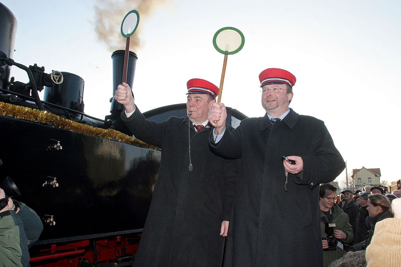 Heute vor zwanzig Jahren: Sachsen-Anhalts damaliger Verkehrsminister Dr. Karl-Heinz Daehre (links) und HSB-Geschäftsführer Matthias Wagener geben den symbolischen Abfahrauftrag für den Premierenzug nach Quedlinburg. (Foto: Matthias Bein)
