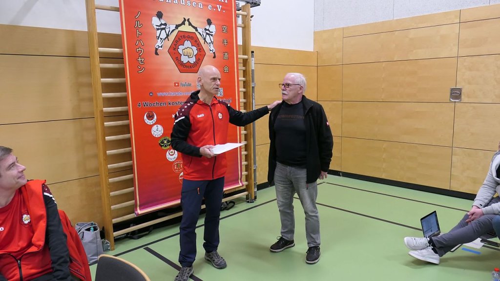 Ein Höhepunkt der Versammlung war die Ehrung verdienter Mitglieder für ihr besonderes Engagement in der Vereinsarbeit. Ausgezeichnet mit der Ehrennadel des Landessportbundes Thüringen e. V. wurden Heike Prophet und Chris Franke. Pascal Breitrück wurde die Ehrennadel des Kreissportbundes Nordhausen e. V. verliehen. Vom Thüringer Karate Verband e. V. wurden Petra Hauschild (Ehrenplakette) und Sandra Kersten (Ehrenurkunde) ausgezeichnet. Mit der Überreichung der GutsMuths-Medaille in Bronze wurden die außergewöhnlichen Leistungen von Willi Völz und Felix Schröter anerkannt. So steht beispielsweise der 73-jährige Völz noch immer vier Tage pro Woche in der Sporthalle und trainiert den Nachwuchs. Der Verein dankte außerdem noch Ines Weniger, Anita Kratzing und Uwe Fabian.