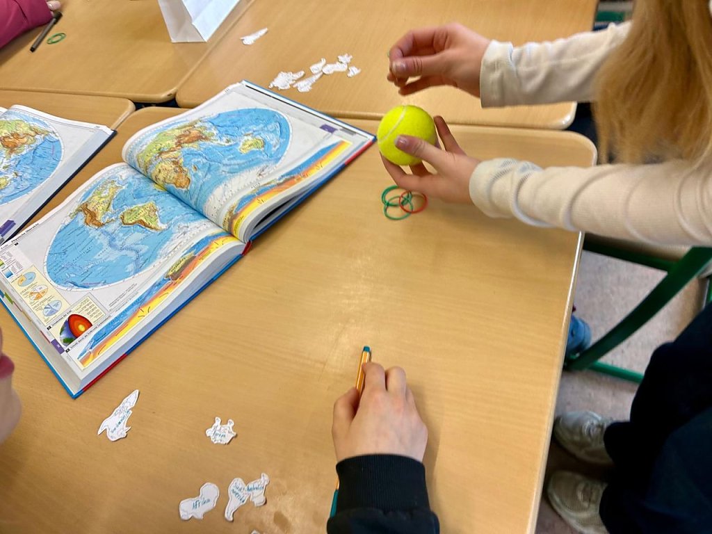 Kreativ wurde es im Geografie-Raum: Ein Tennisball verwandelte sich unter geschickten Händen nach und nach in eine blaue Weltkugel, auf die die Kontinente geklebt wurden – Geografie zum Anfassen.