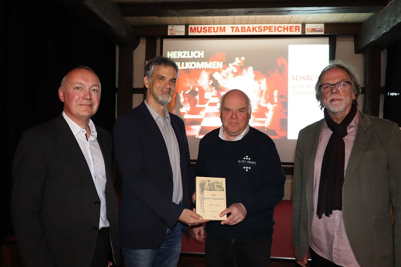 Gemeinsam mit Oberbürgermeister Kai Buchmann, Dirk Schimm, 2. Beigeordneter des Landkreises Nordhausen und Vertreter des SC 1951 Nordhausen sowie Konrad Reiß, Gründer und Leiter des Schachmuseums Löberitz, eröffnete Jürgen Rennebach als Museumsleiter am 14. März die neue Ausstellung Schach - Durch Welten und Zeiten.