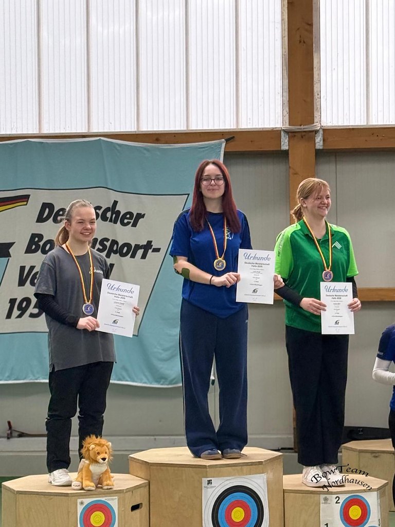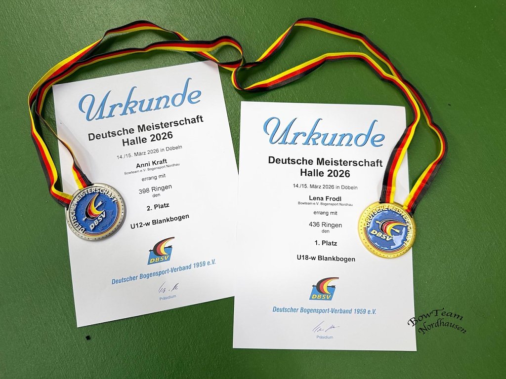 Am darauf folgenden Wochenende zog es unsere Bogenschützen nach Döbel zur Deutschen Meisterschaft für Bögen ohne Visier. Am Samstagvormittag gingen Lena Frodl und Anni Kraft an den Start. Für Lena Frodl war es die zweite Deutsche Meisterschaft in der Halle jedoch in einer neuen Altersklasse, während Anni Kraft ihre erste Deutsche Meisterschaft bestritt.