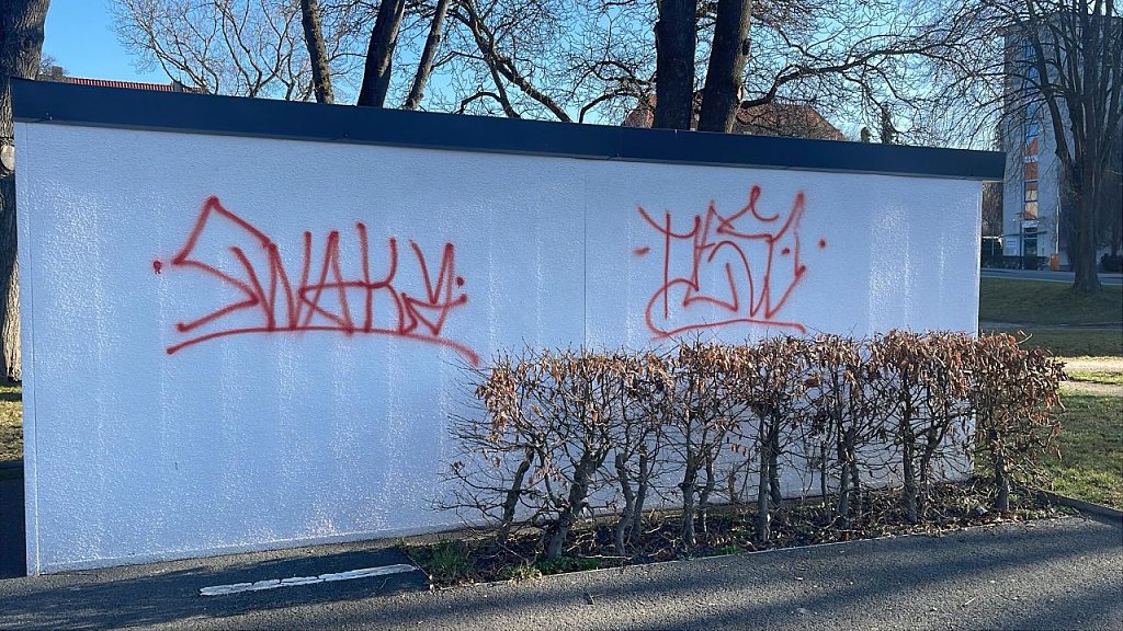 - Garage am Rentamt: Am 12. März fielen die ersten massiven Schmierereien an der Garage hinter dem Verwaltungsgebäude Rentamt auf. Die Täter verunstalteten die Anlage gleich auf zwei Seiten.