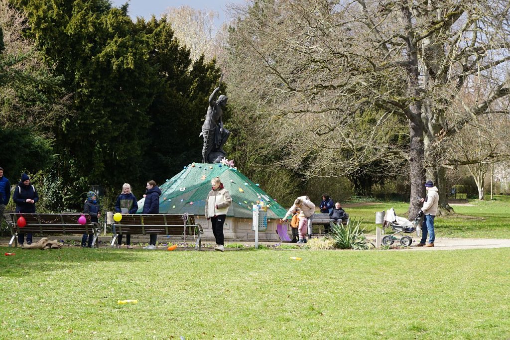 Vor allem Familien zog es zur Brunnenrallye der Provita-Akademie. An neun Stationen konnten die Kinder spielerisch Aufgaben lösen und Stempel sammeln. Die Kinder und auch die Eltern finden die Aktion super, sagten Alice und Joyce, zwei Sozialassistentinnen-Schülerinnen, die ihre Eierlauf-Station an der Wasserachse betreuen. Zwar liegt ihr Brunnen etwas abseits, doch das tut der Stimmung keinen Abbruch. Regelmäßig kommen viele Kinder vorbei und machen mit.
