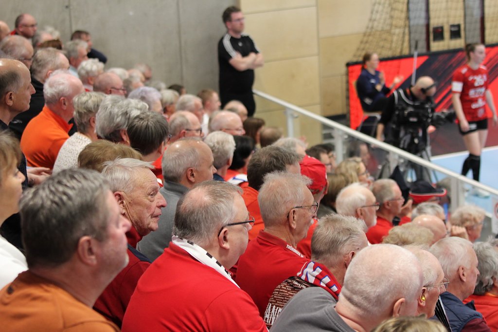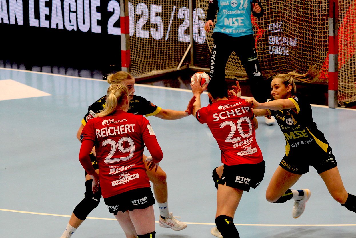 In einer nervösen Anfangsphase gerieten die Gastgeberinnen schnell in Rückstand und konnten sich nur dank einer überragenden Johanna Reichert im Spiel halten. Nach dem Zweitorerückstand nach elf Minuten war der Vorsprung aus dem Hinspiel nach einem Viertel der Spielzeit bereits aufgebraucht und es stand 9:13 nach 15 Minuten. Gefühlt war zu diesem Zeitpunkt jeder Wurf der Däninnen ein Treffer, während die Thüringerinnen einige Abschlussproblem offenbarten und im Abwehrverbund keinen sicheren Eindruck hinterließen. Folgerichtig erhöhten die Gäste weiter und führen zwischenzeitlich mit sechs Toren Vorsprung. Doch die Müller-Mädels steckten nie auf und spätestens als Laura Kuske in der 28. Minute einen Siebenmeter der bis dahin treffsicheren Clara Lerby parieren konnte, war die Rote Wand da und unterstützte ihr Team frenetisch. Mit 18:22 ging es in die Kabinen und vieles sprach zu diesem Zeitpunkt für die Damen aus dem nordischen Nachbarland.
