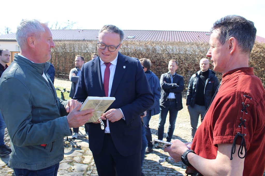 v.li.n.re Reinhard Mascher (Bürgermeisters der Gemeinde Herbsleben); Ministerpräsident Mario Voigt (CDU); Christian Hirte Parlamentarischer Staatssekretär beim Bundesminister für Verkehr (CDU); Landrat des Unstrut-Hainich-Kreises Thomas Ahke; Jane Croll (CDU); Dipl.-Ing. Erhard Georgi (HTI Greußen) (Foto: Eva Maria Wiegand)