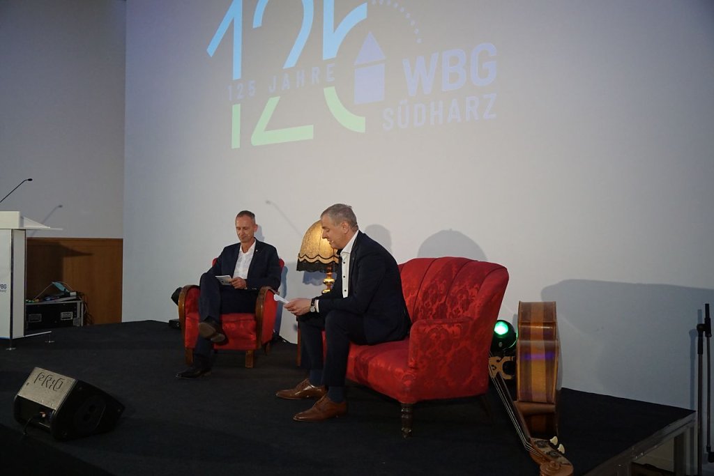 Moderator Thomas Müller hatte eine ganze Karteikarte mit Nordhäuser Straßennamen gefüllt, in denen die WBG Häuser hat. Und das sind bei weitem nicht alle Straßen. An der WBG kommt man in Nordhausen einfach nicht vorbei, sagte Müller. Er stand auf einer Bühne, die ein roter Sessel und eine rote Couch mit Stehlampe symbolisch in ein Wohnzimmer in den 1920er Jahren verwandelten.