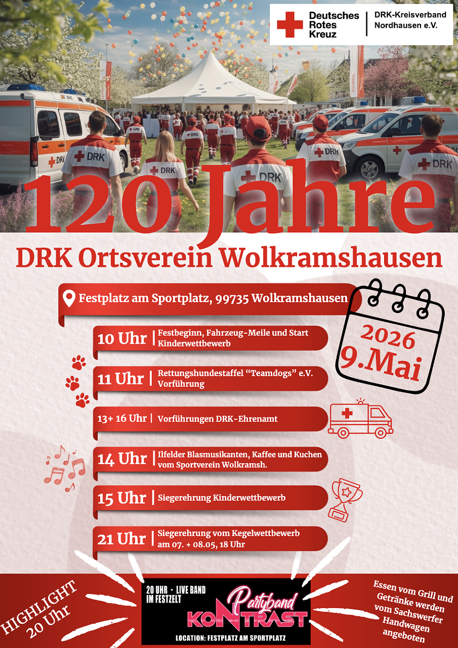 Der DRK-Ortsverein Wolkramshausen feiert im Mai sein 120-jähriges Bestehen mit einem großen Fest. Rettungshunde-Vorführungen, Ilfelder Blasmusikanten und die Liveband Kontrast" sorgen für Programm...Der DRK-Ortsverein Wolkramshausen begeht am 9. Mai sein 120-jähriges Jubiläum mit einem ganztägigen Fest auf dem Festplatz am Sportplatz. Besucher erwartet ein vielseitiges Programm für alle Altersgruppen.