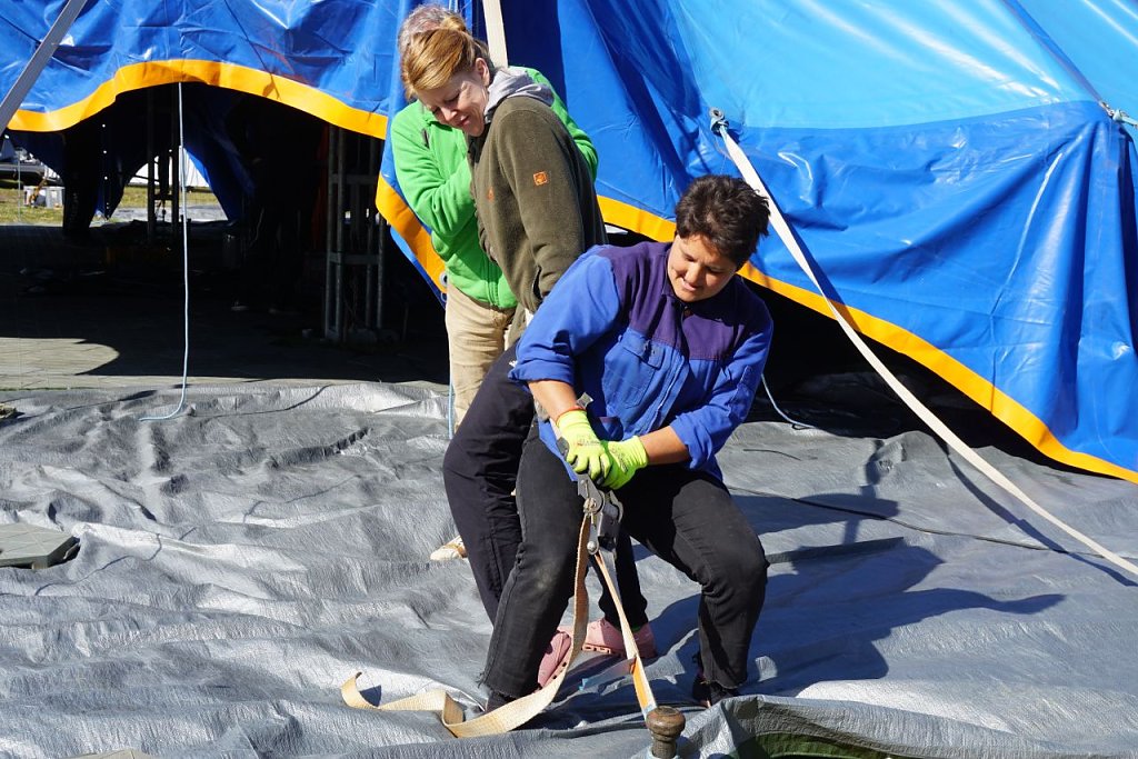 Kurz vor 11 Uhr erreichte das riesige Zeltdach seine endgültige Höhe. Das ist schon kräftezehrend, sagte Organisatorin und Festivallotsin Steffi Böttcher. Beim Aufbau müssen mehrere Helfer die an Stahlseilen befestigte Kuppel mit langen Hebeln Stück für Stück nach oben bewegen. Zwischen zehn und 15 Menschen vom Verein Studio 44 und Freiwillige waren in den vergangenen Tagen täglich im Einsatz. Das ist schon ein echtes Gemeinschaftsprojekt, sagt Steffi Böttcher.