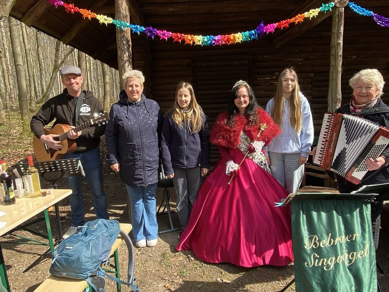Die Bebraer Singvögel waren angereist, um das große Fest musikalisch zu umrahmen. Diese Folkloregruppe existiert seit 52 Jahren. In dieser Zeit kam es zwar immer wieder zu Wechseln von Mitgliedern, aber die Folklore blieb. In ihren Begrüßungsworten betonte die Chefin, Frau Siegmund, dass auch ihre Gruppe eng mit der Natur und der Heimat verbunden ist. Die Auftritte zu den Blutbuchenfesten des Hainleite-Wandervereins sind für sie eine Herzenssache. Bisher sind sie zu jedem dieser Feste aufgetreten und es ist eine enge freundschaftliche Beziehung erwachsen. Auch heute sangen sie bekannte Wander- und Volkslieder und es wurde mitgeklatscht und mitgesungen. Als die beiden Nachwuchssängerinnen Henriette und Angelina das Lied Oma so lieb… sangen, waren bei den älteren Wanderinnen Tränen in den Augen zu sehen.