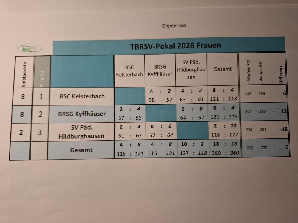 Wir danken den Helferinnen und Helfern des SV Päd. Hildburghausen für die Unterstützung der Veranstaltung und für die gute Verpflegung. In der Hoffnung, dass sich beim nächsten TBRSV-Pokalturnier 2027 in Arnstadt mehr Mannschaften aus den anderen Bundesländern beteiligen, möchten wir Bosslerinnen und Bossler uns von der Bosselgemeinschaft Hildburghausen verabschieden.