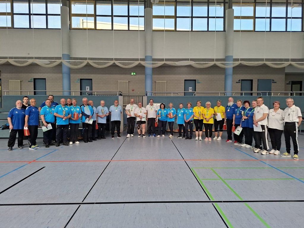 Zuvor jedoch, gab es eine kleine Einlage der jüngsten Sportlerinnen des SV Pädagogik Hildburghausen. Die Joyrobic- Gruppe zeigte Ihr Können und bekam dafür tobenden Applaus. Nachdem man sich zur Mittagszeit gestärkt hatte, wurde die Rückrunde gespielt. Nach 10 Spielrunden, so gegen 14:00 Uhr, standen die Sieger fest. Bei den Damen erreichte die Mannschaft des BSC Kelsterbach mit 8 Spielpunkten den 1. Platz und somit den Turniersieg. Den 2. Platz belegten mit ebenfalls 8 Spielpunkten die Damen von der BRSG Kyffhäuser (Christa Fischer, Erika Oehme, Angelika Schmid). Hier wurden die Spiele untereinander gewertet. Platz 3 erkämpften sich die Damen des Ausrichters SV Päd. Hildburghausen mit 2 Spielpunkten.