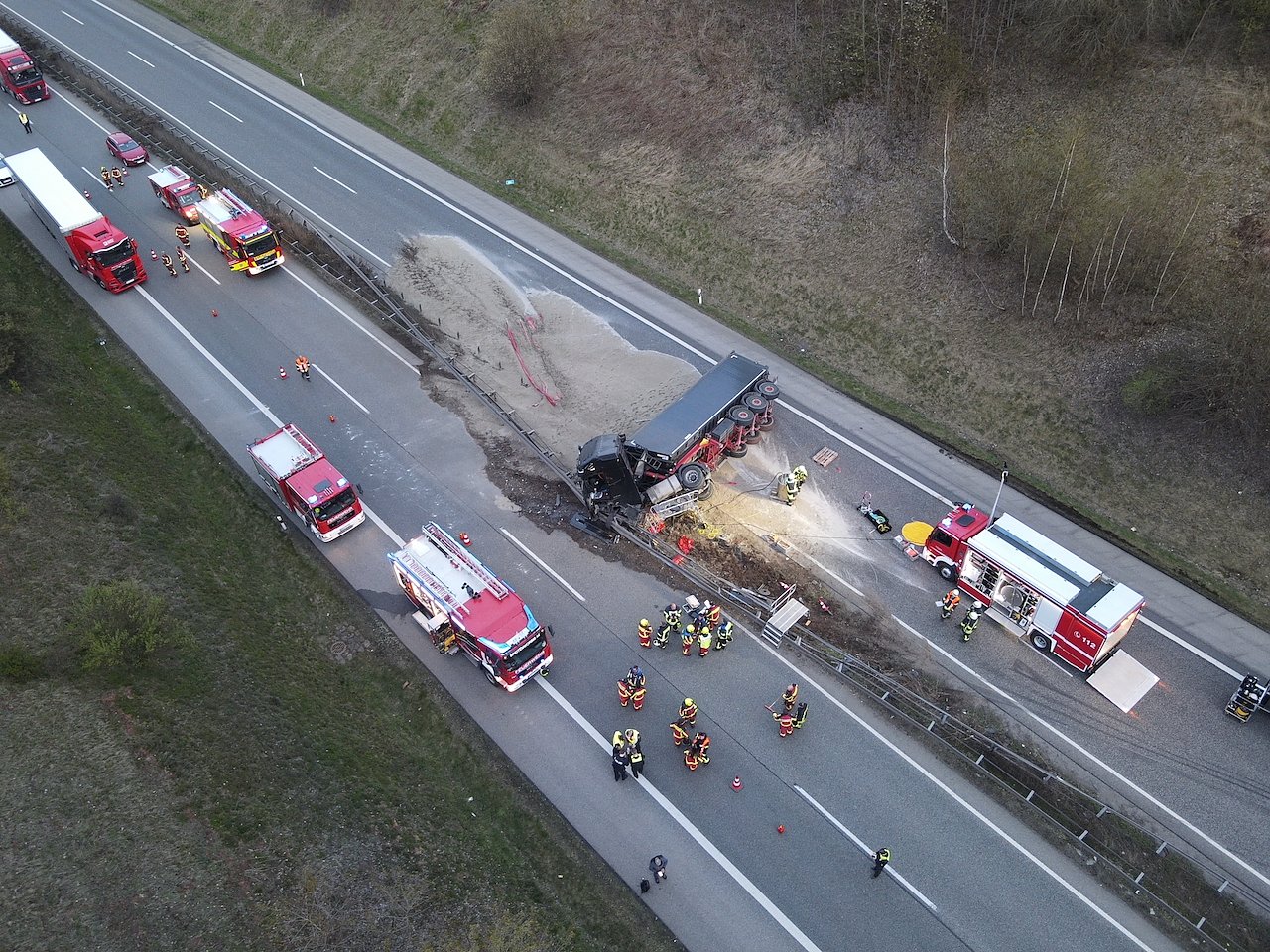 Der LKW-Fahrer wurde bei dem Unfall leicht verletzt. Der Gesamtsachschaden wird vorläufig mit 75.000 Euro beziffert. Der Verkehr staut sich in beide Fahrtrichtungen.