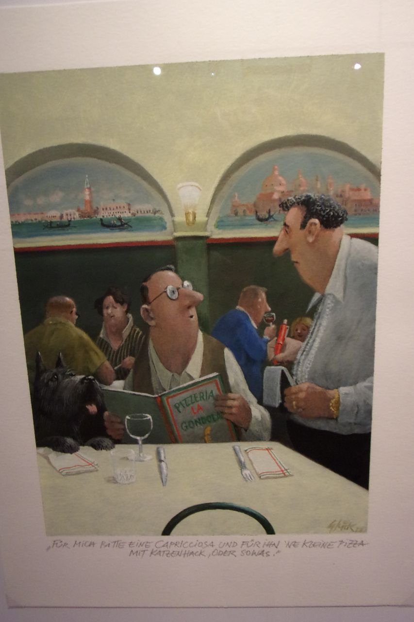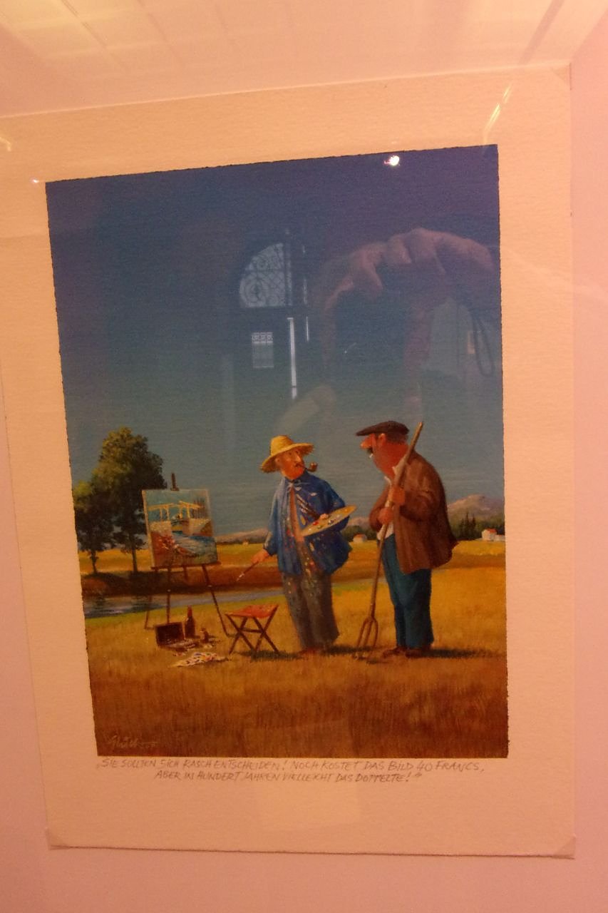 Den Gedanken, dass in dieser Werkschau die Arbeiten zum Thema Kunst und des zwischenmenschlichen Alltags im Fokus stehen, greift Hinsching nach einem kunstgeschichtlichen Exkurs in ihrer Laudatio schließlich auf. Sie sieht in Glück den seit vielen Jahren gefragtesten humoristischen Künstler im deutschsprachigen Raum. Und erinnert zudem daran, dass bereits vor 10 Jahren die Werke Glücks die Wände der Jugendstilvilla schmückten und der Künstler mit seiner Gattin selbst zugegen war.