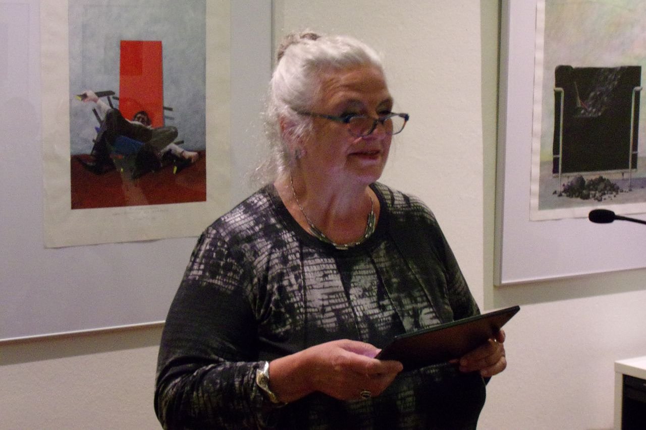 Und an der Stelle, wo ansonsten bei einer Vernissage Musik erklingt, ist an diesem Abend Anja Eisner präsent. Die langjährige Chefdramaturgin am Theater Nordhausen stimmt mit humorvollen Texten, u.a. aus der Feder von Joachim Ringelnatz oder Christian Morgenstern, auf die Werke des Kasseler Künstlers gekonnt ein. Da verwundert es nicht, dass nach diesem Wort- Beitrag reichlicher Beifall nicht ausbleibt.