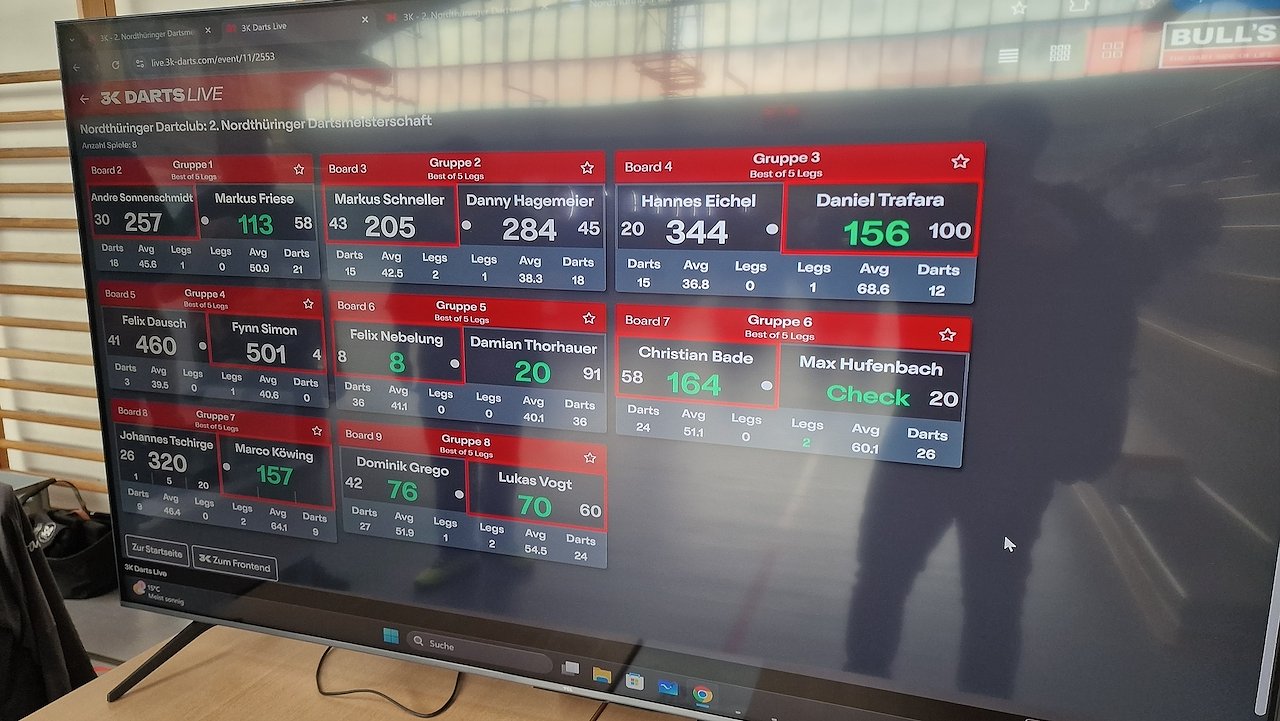 Eine Runde, bei den Dartspielern Leg genannt, beginnt mit einem Punktekonto von 501 Punkten, die abgebaut werden müssen. Je nachdem wo die Pfeile treffen werden unterschiedliche Punktzahlen erzielt, die vom Konto abgezogen werden. Die höchste mögliche Punktzahl bei drei Pfeilen sind drei Treffer im Triple 20 Feld, also 180 Punkte, gerade zu Ende eines Legs geht es aber nicht mehr um möglichst viele Zähler, sondern genaue Treffer im passenden Feld. Erfolg und Misserfolg können Millimeter auseinander liegen, das macht jede Partie spannend, meint Könitzer, Spiele können hin und her kippen, je nachdem wie die Pfeile fliegen. Gespielt wurde gestern zunächst in einer Gruppenphase zu acht Gruppen an acht Scheiben, danach ging es im Double Out weiter der doppel K.O. Phase im Dartsport. Organisiert wurde der Auftakt durch die sieben Gründungsmitglieder des Vereins und 15 Helfer, wenn die Sache weiter gut läuft, wolle man zwei bis vier Turniere im Jahr auf die Beine stellen, sagt Könitzer. Der Zulauf war bereits jetzt gut, die meisten Teilnehmer kamen aus dem Äquator der A38 und sogar von der anderen Seite des Harzes. Wer mehr zu dem jungen Verein wissen möchte, findet den Dartclub im Internet und auf den sozialen Medien.