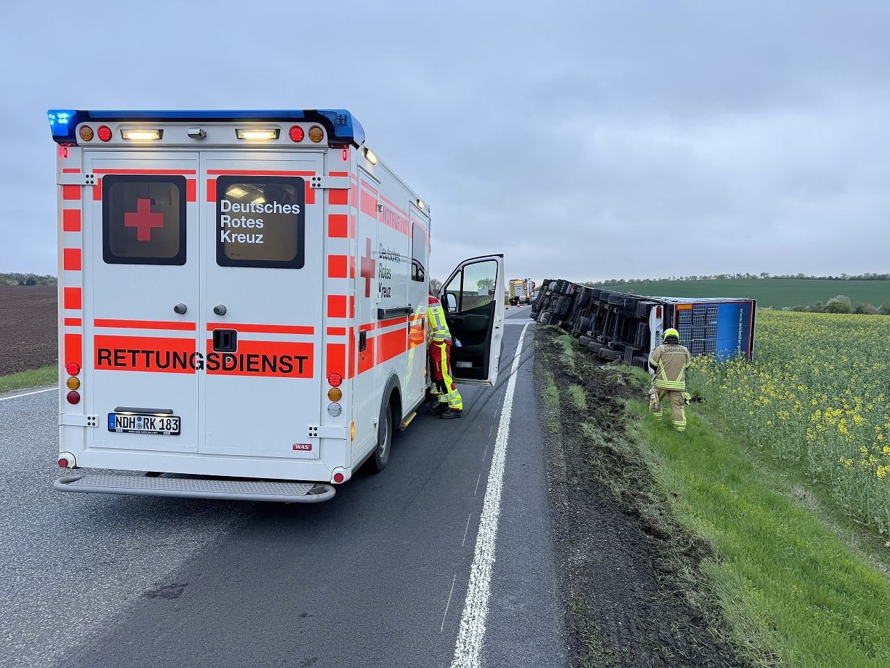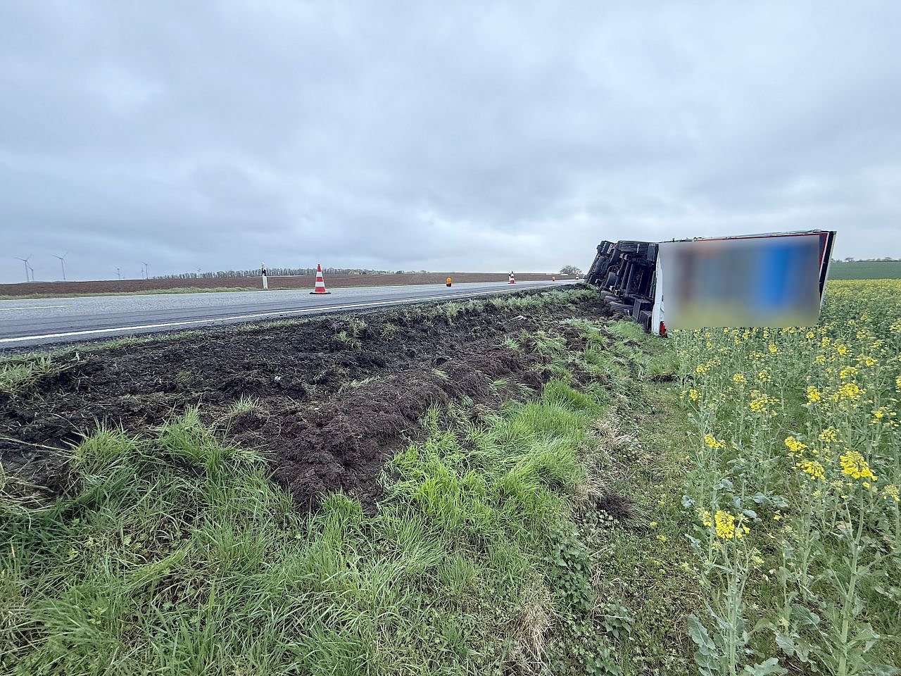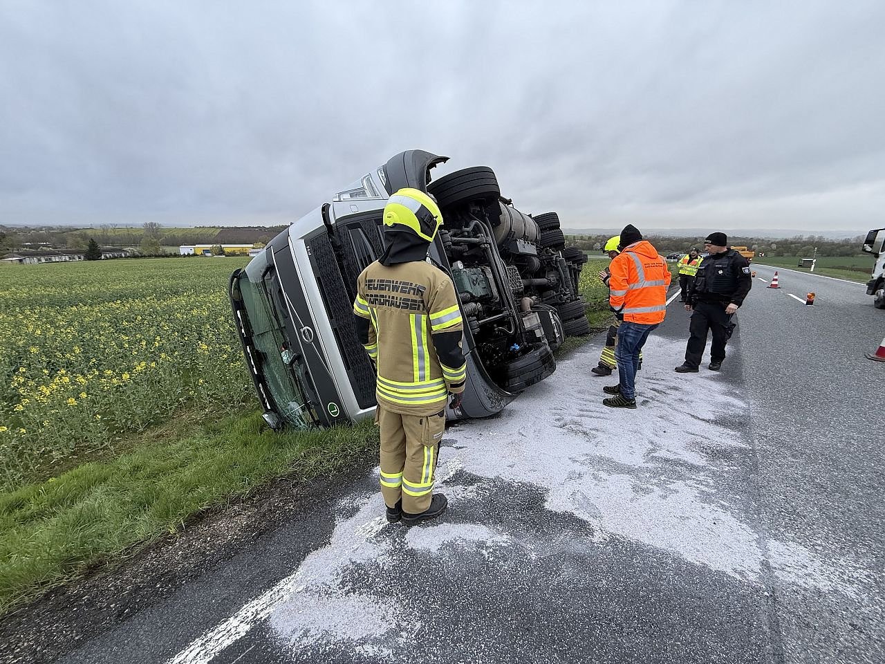Zu einem LKW-Unfall kam es am Montagmorgen im Landkreis Nordhausen. Ersten Erkenntnissen nach befuhr der polnische Sattelzug die B4 von Nordhausen kommend in Fahrtrichtung Sondershausen. Kurz hinter Steinbrücken kam der 53-jährige Fahrer mit seinem Sattelzug gegen 6.30 Uhr nach rechts von der Fahrbahn ab und kippte eine Böschung hinab.