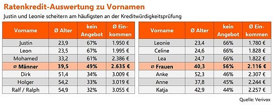 Wer Justin oder Leon heißt und einen Kredit aufnehmen möchte, findet in zwei von drei Fällen keine Bank, die dazu bereit ist, ihnen das benötigte Geld zu leihen. 67 Prozent aller Verivox-Kunden mit diesen Namen erhielten auf ihre Kreditanfrage kein Finanzierungsangebot. Bei den Frauen bleiben die Kreditanfragen von Personen namens Leonie, Celine und Lea in jeweils 66 Prozent aller Fällen ohne Bankangebot.