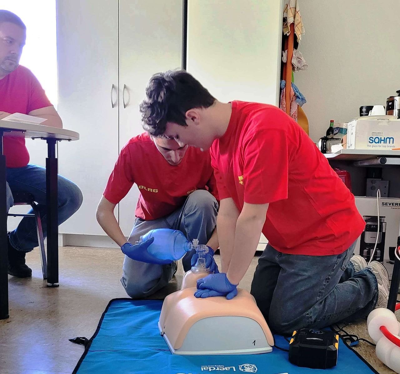Weitere Szenarien waren die Versorgung eines Insektenstichs, Maßnahmen gegen einen Hitzschlag und schließlich die Reanimation des Schwimmmeisters, der nach einem Stromschlag bewusstlos am Boden lag.